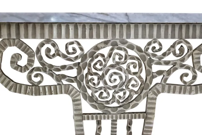 Console table with white marble top.