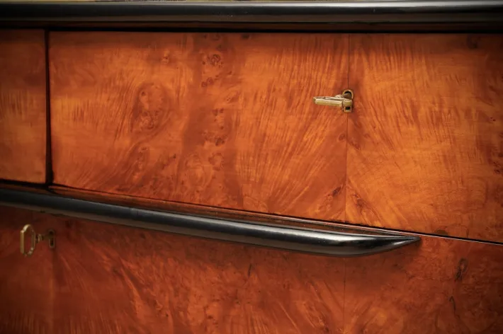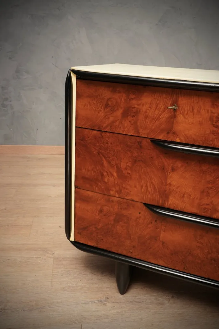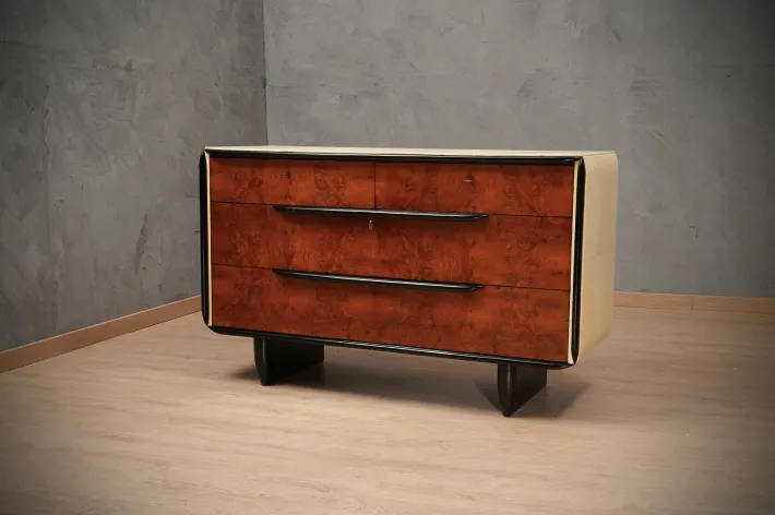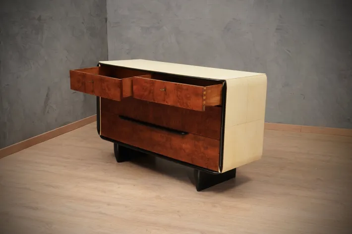 The chest of drawers is composed of a body completely covered in goatskin, upper top and sides, while the drawers are veneered in walnut, you can see the beautiful essence chosen with particular wood grain to form a beautiful design. There are four drawers in total, two smaller upper ones side by side and two larger lower ones. The two upper ones can be opened with the brass key, while the two lower ones in addition to the key also have a beautiful molded wooden black lacquered handle along almost the entire drawer. The same moldings are present along the perimeter of the dresser. The chest of drawers is raised from the ground by two legs positioned transversely to it; they are black too. Very classy this Italian dresser, that with its design represents precisely this Art Deco period.