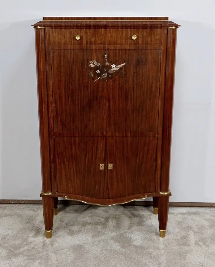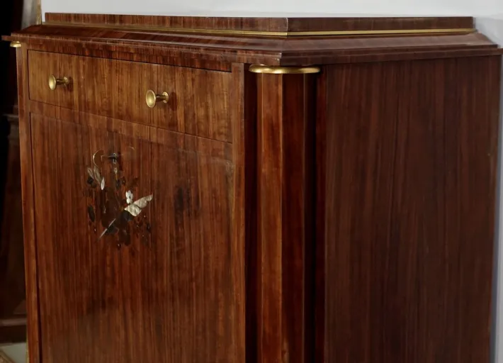 Inlaid on the inside of the right door, we find the signature of Jules Leleu on an ivory plate.