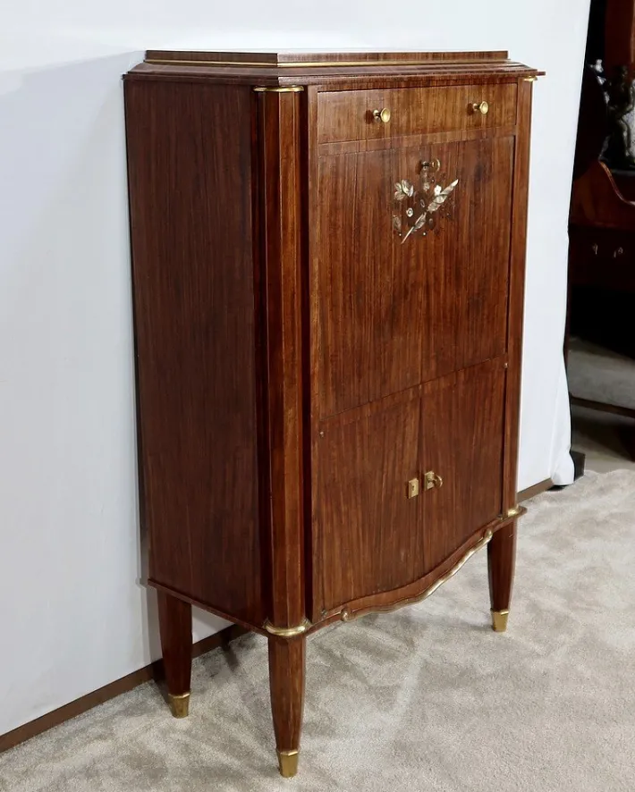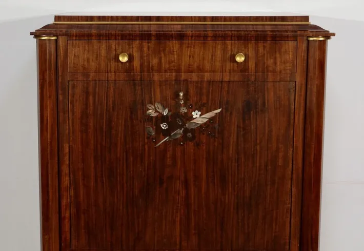 A slaughter decorated with inlays of precious wood representing a plant scene opens using an original key and lock in working order. At the opening we discover an interior in Sycomore with the exception of shelves and separations. This storage space has a small drawer on each side, accompanied by niches.