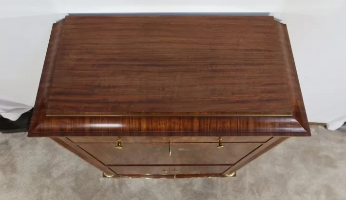 This quality furniture with refined mahogany veneer lines has in the upper part a drawer opening with two brass buttons slightly in a bowl.