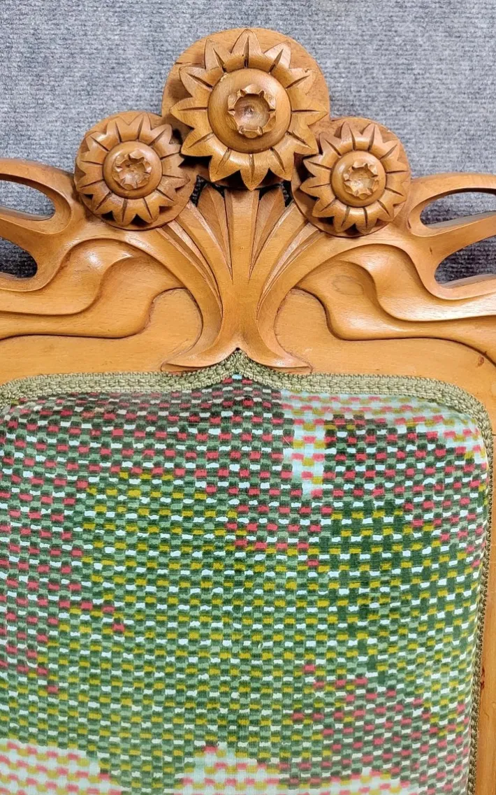 high backrest adorned with stylized bouquets of flowers
