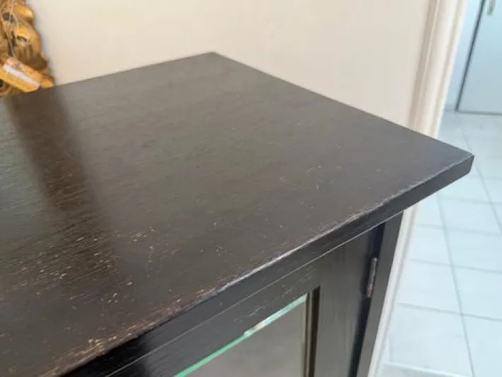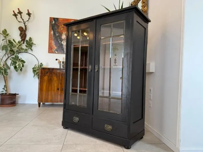 Original Art Nouveau display cabinet from around 1900, made in elegant black with an impressive Tiffany glass front. The piece of furniture impresses with its straight, clear Art Nouveau design and perfectly showcases your collectibles or decorative objects. The display case is keyed, smells fragrant and is well-maintained on the inside. It is in very good condition – an authentic piece with character and charisma. As it is delivered assembled (cannot be disassembled), you can use the piece of furniture straight away and integrate it into your living environment. The combination of the deep black surface and the interior fittings in particular creates a stylish effect. This piece is an absolute eye-catcher both for classic interiors and as an exciting contrast in modern architecture.