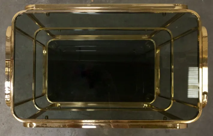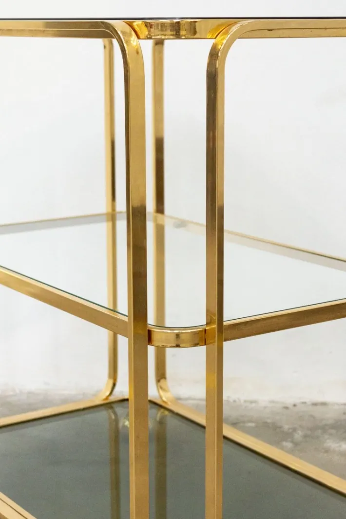 Very elegant and versatile, it features three glass shelves. The central one was missing, so we had it made transparent to give the whole thing greater depth, along with the two smoked glass shelves above and below.