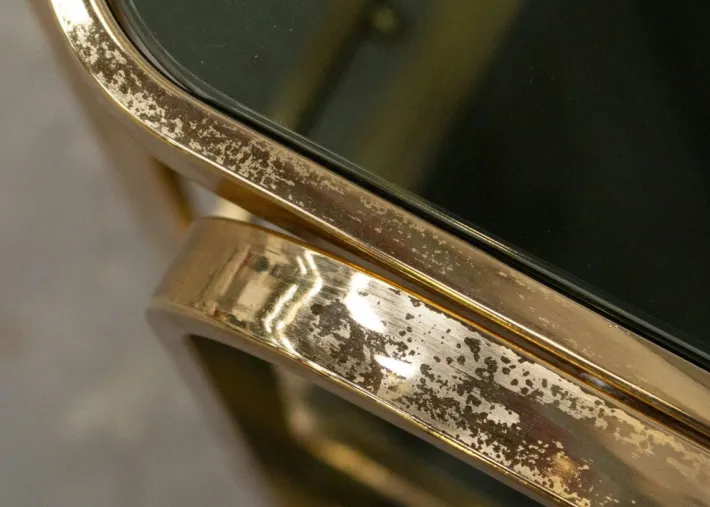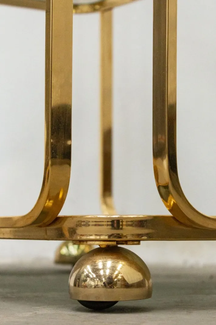 The metal frame is solid and in excellent condition, with slight signs of wear on the gilding consistent with its age. The four wheels, hidden by metal hemispheres, are very beautiful and work well.