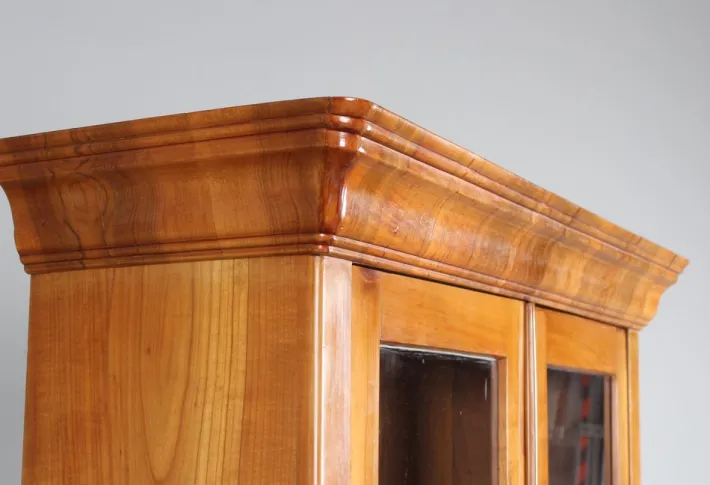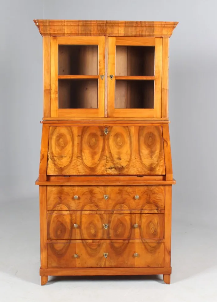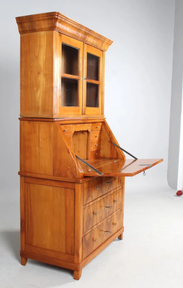 The secretary part is veneered at the top, so that the piece of furniture can also be set up without the display cabinet attachment, as shown in the photos.