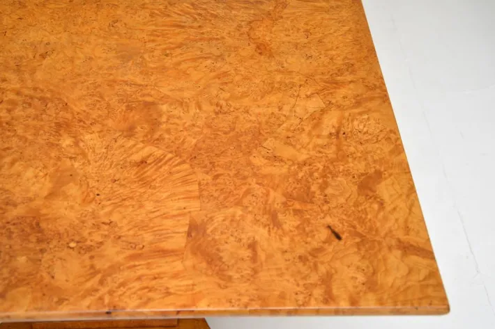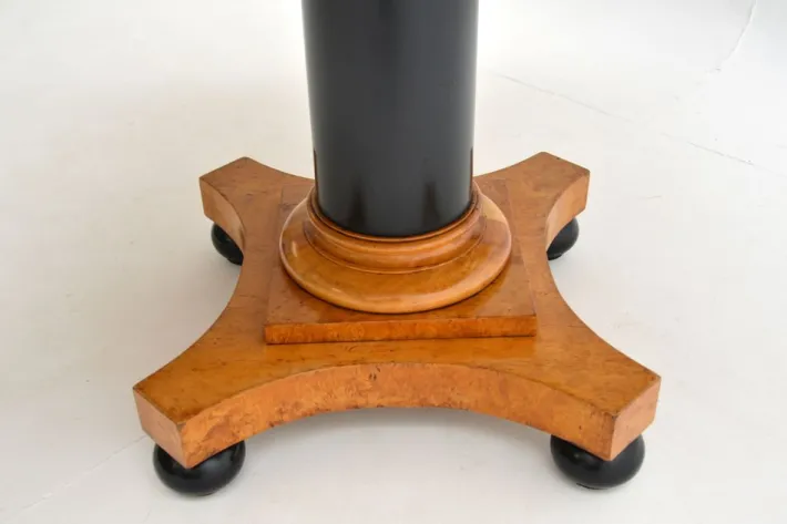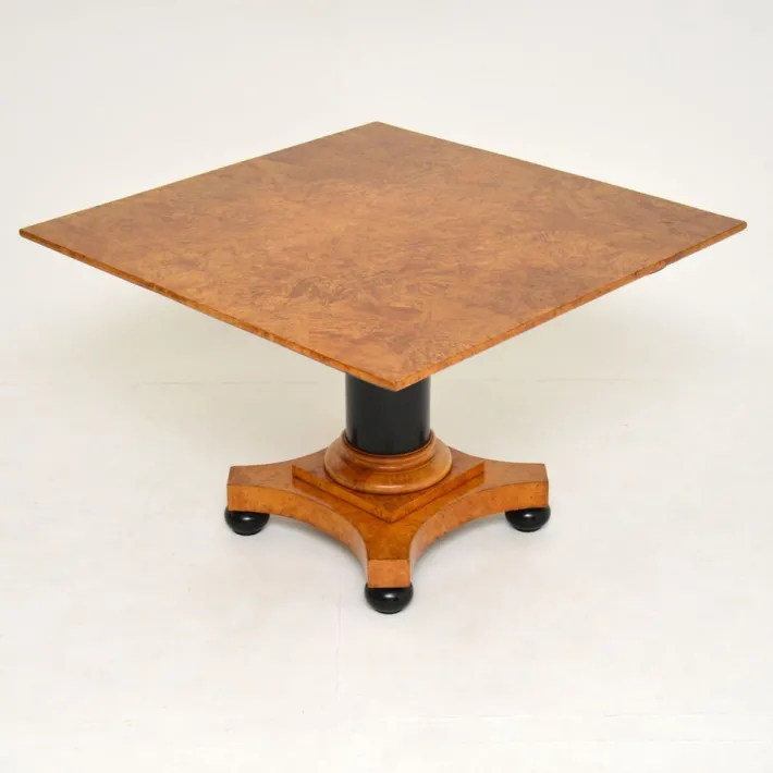 The square top is large and has the most exquisite colour and grain patterns. It is supported by a thick pedestal column which stands on a stepped platform base, which in turn sits on turned bun feet.