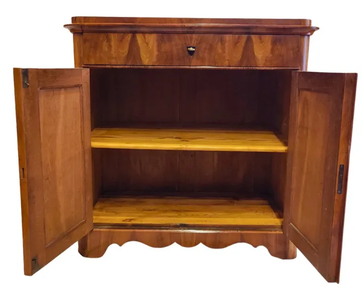 It features one drawer above two paneled doors, opening to a spacious compartment with shelf. The cabinet stands on a shaped base and displays warm patina and balanced proportions.