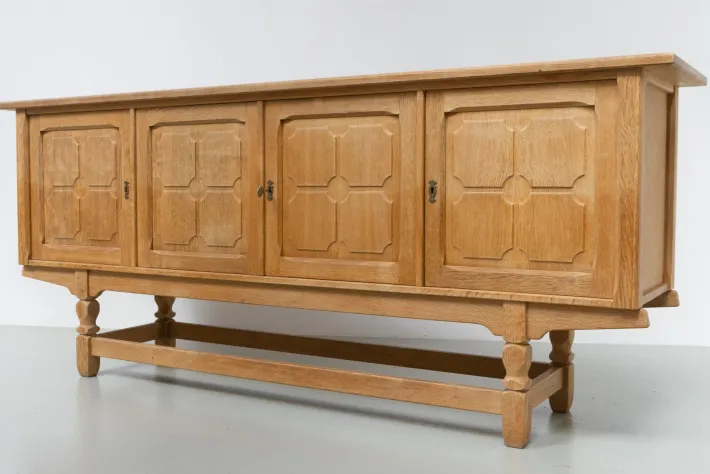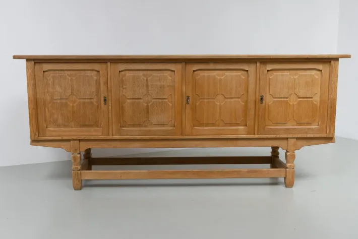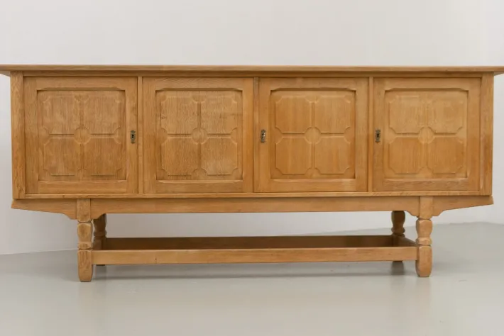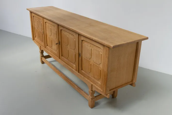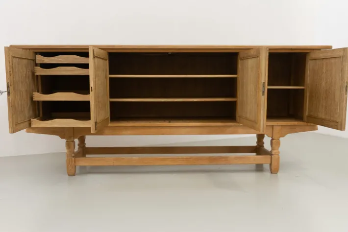 Long and low Scandinavian Mid-Century Modern sideboard in solid Nordic white oak. Brutalist design by Henning Kjærnulf for EG Møbler, Denmark.