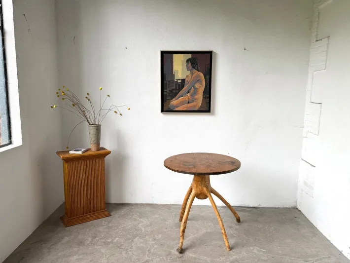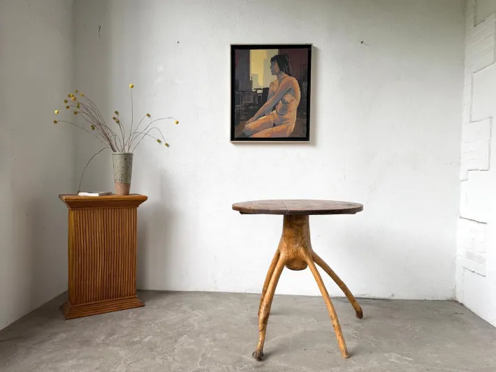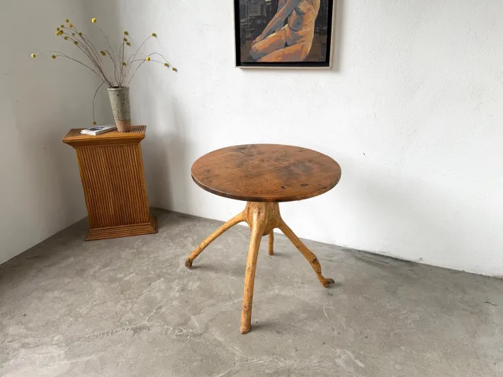 A rare piece, perfect as a pedestal table, side table, or small dining table in an eclectic, bohemian, or wabi-sabi interior.