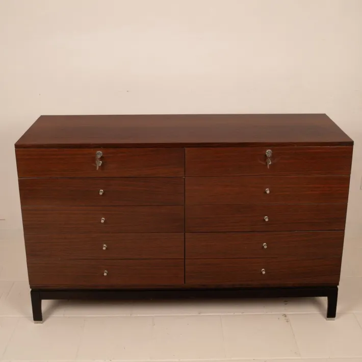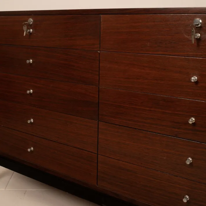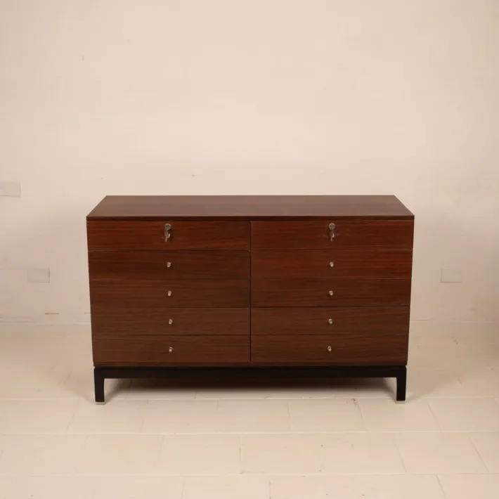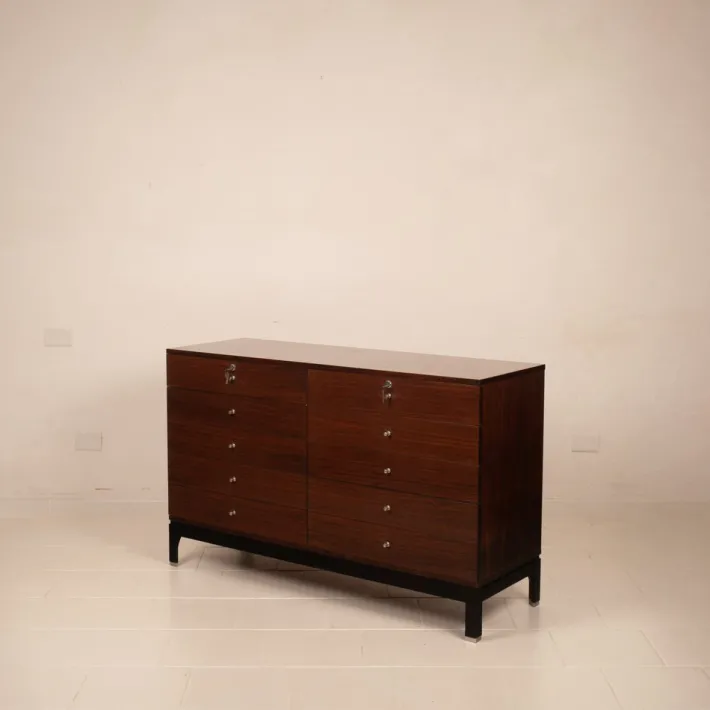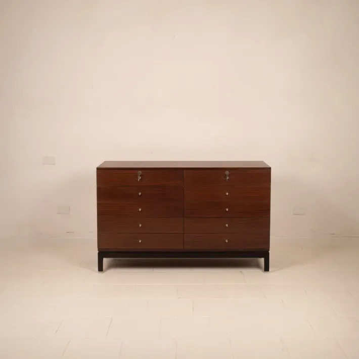 This chest of drawers represents an exemplary example of MIM’s production, a company that introduced a new concept of furniture for executive and domestic environments to Italy, combining design, artisanal quality, and functional research.