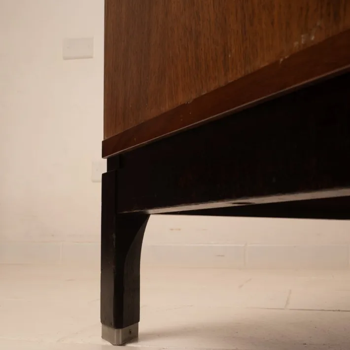 Distinctive Design: Sober and rigorous lines, minimal circular nickel-plated steel handles, original locks with keys, geometric ebony lacquered wood base