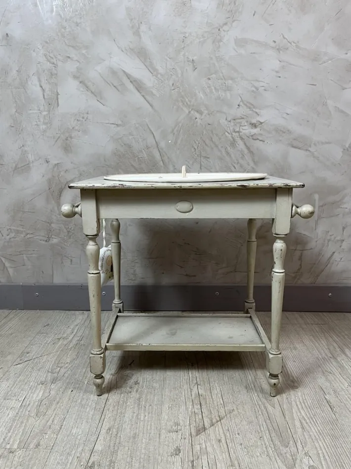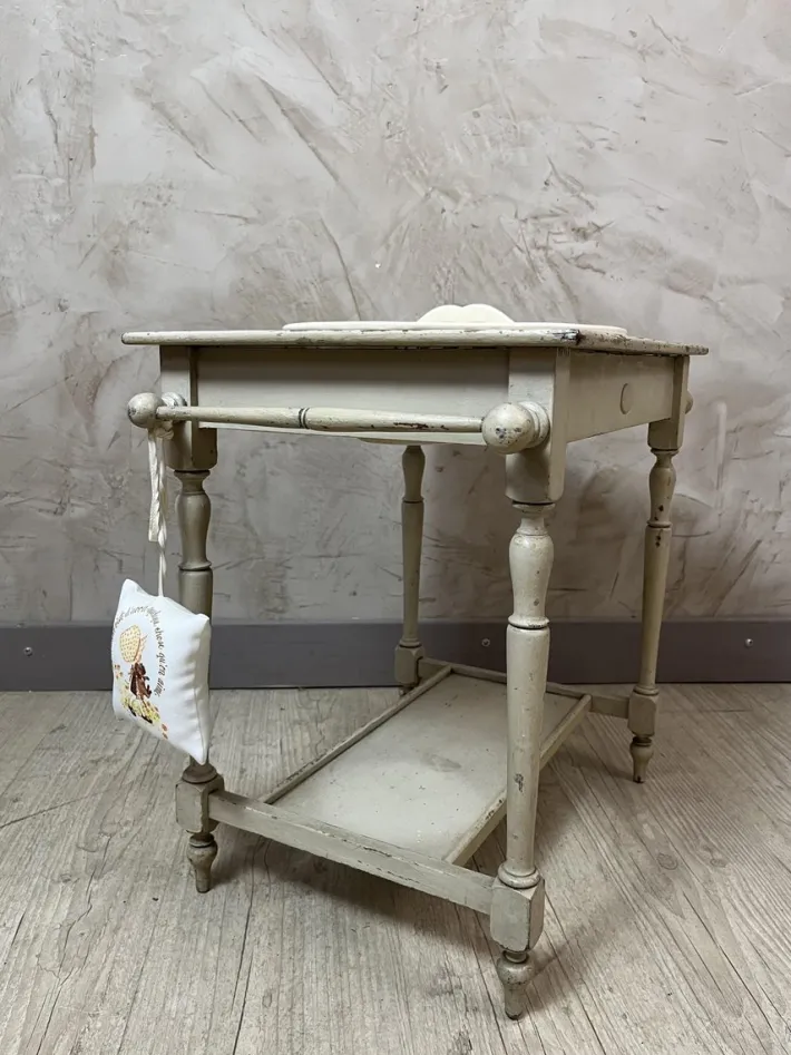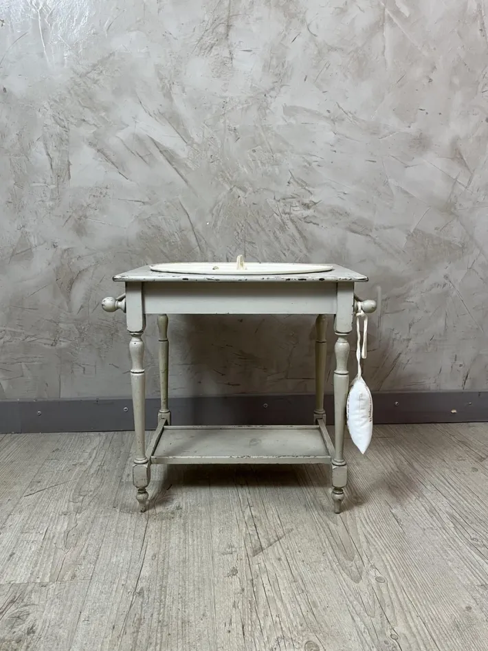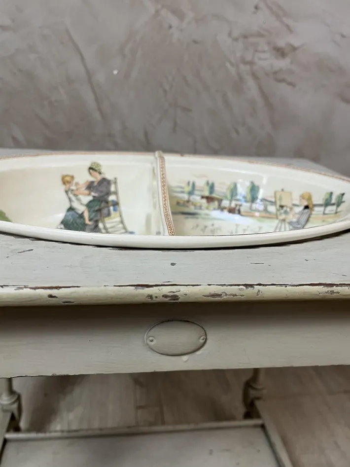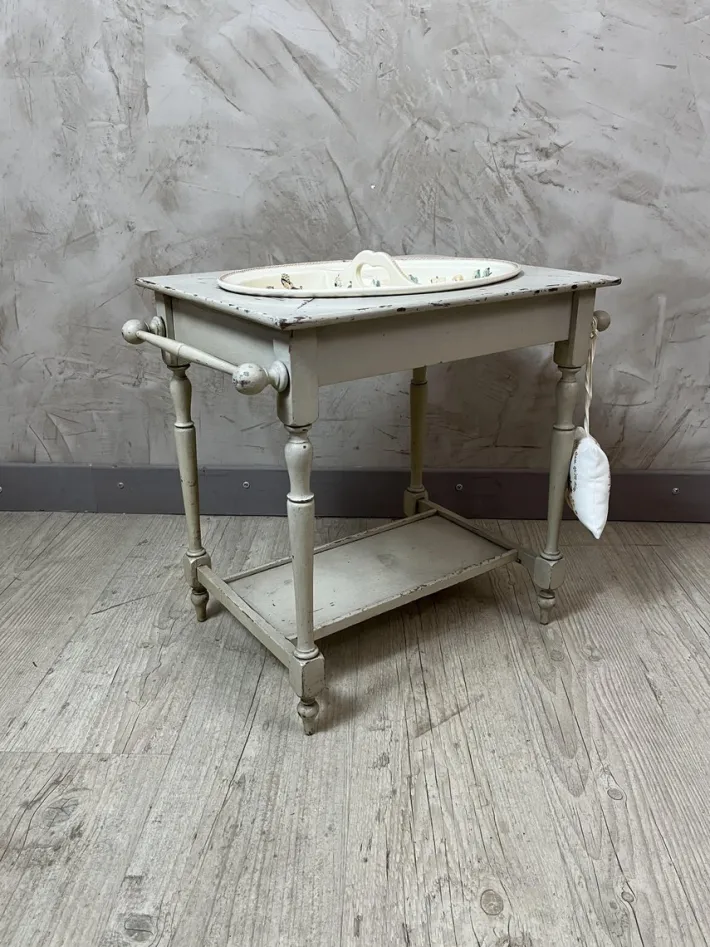 – Delicate patterns: It is adorned with a miniature porcelain bowl and pitcher decorated with childish and bucolic scenes, adding a touch of softness.