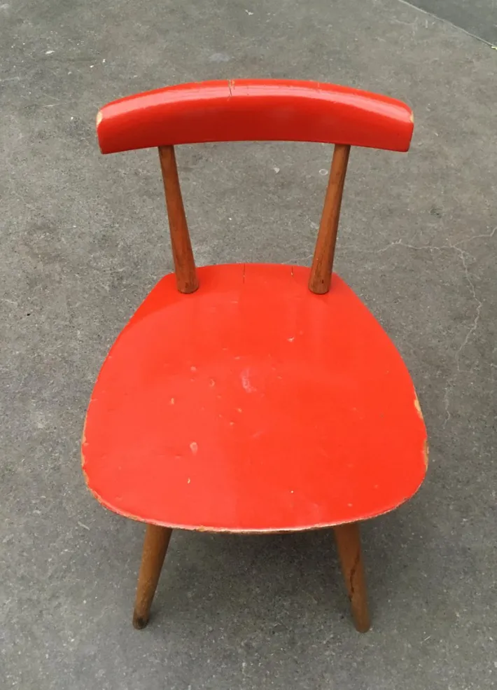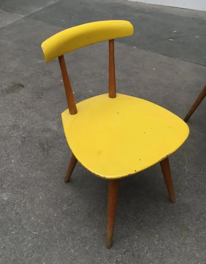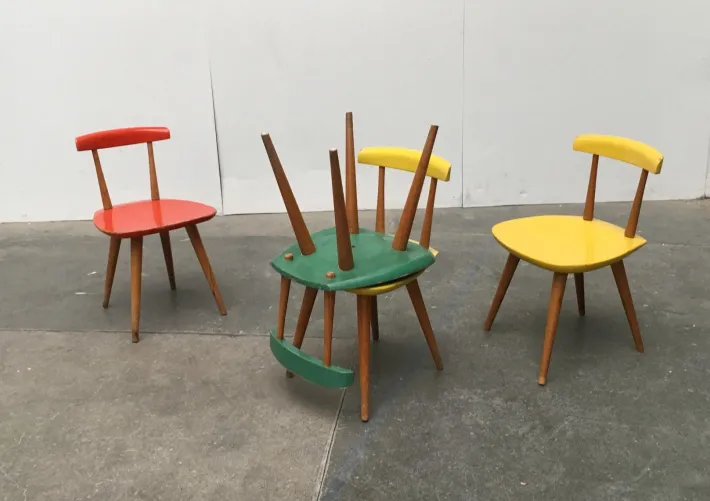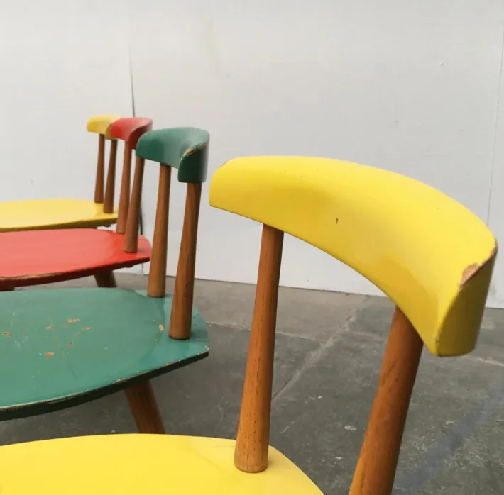 The chairs are very simple and handcrafted. The construction is legible. The two solid wooden rungs of the backrest are inserted, the 4 solid wooden legs are screwed. The backrest and seat are contrasting colors. A wonderful contrast between the colored elements and the natural tone of the wood.