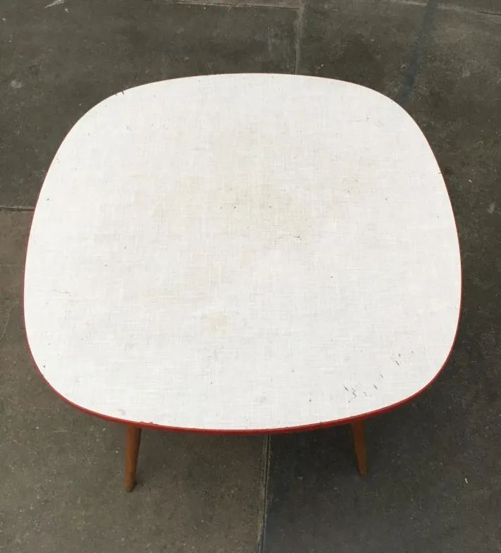 The legs of the table are also made of solid wood. The table surface is coated and has a fine pattern. The red edging on the edge is particularly striking.