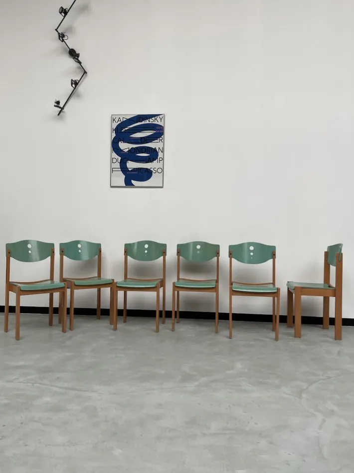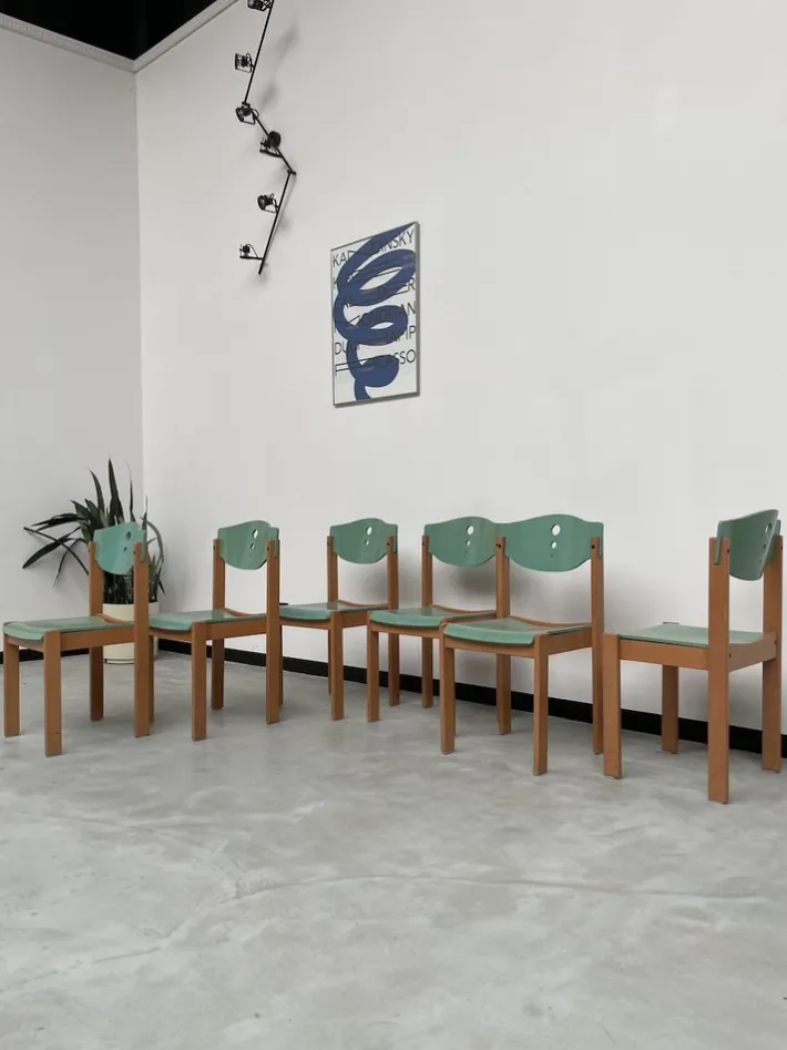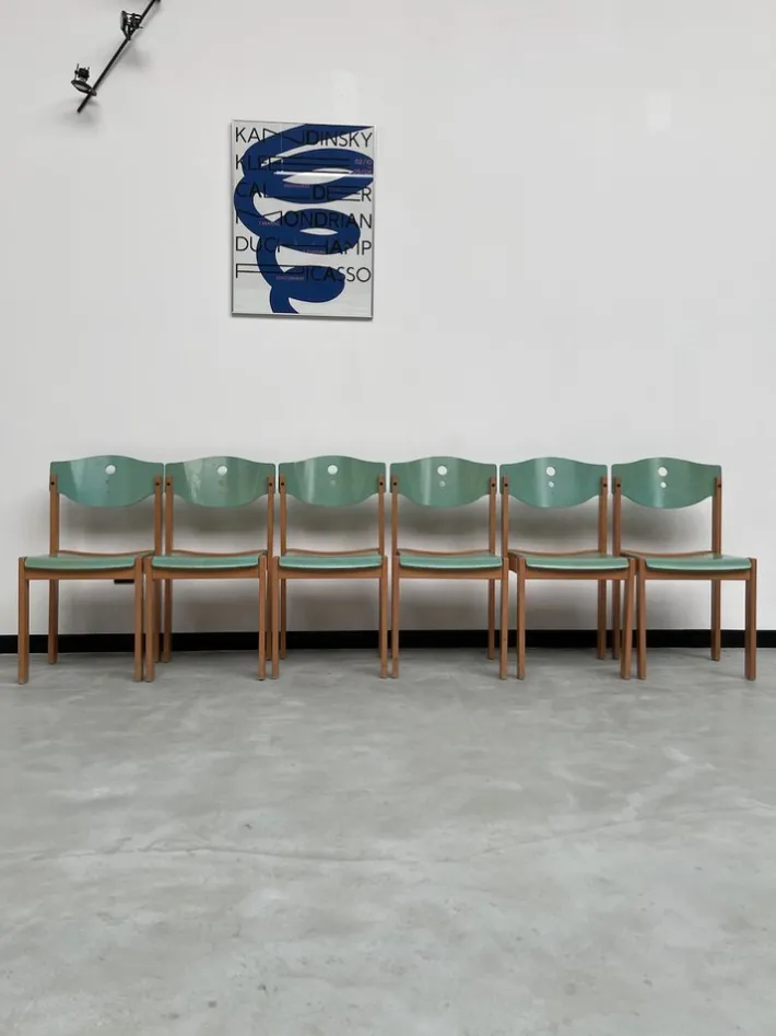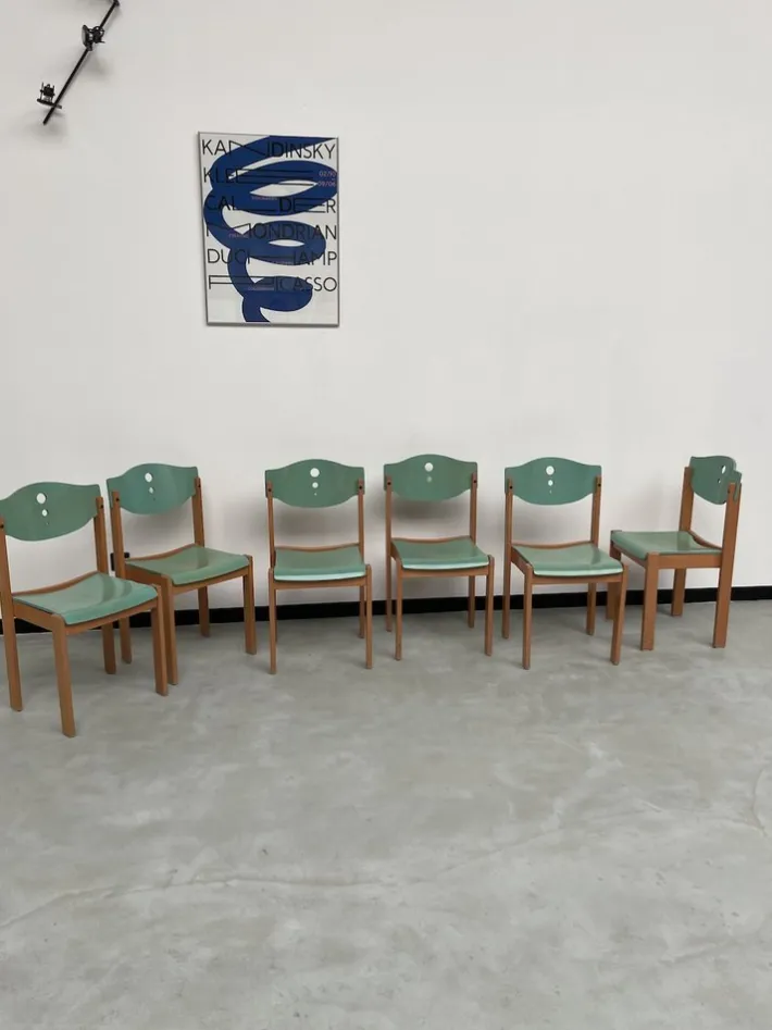 Gold-coloured solid beech frame and green-stained seats and backrests. Attractive graphic shape with round details on the backrests. Stackable.