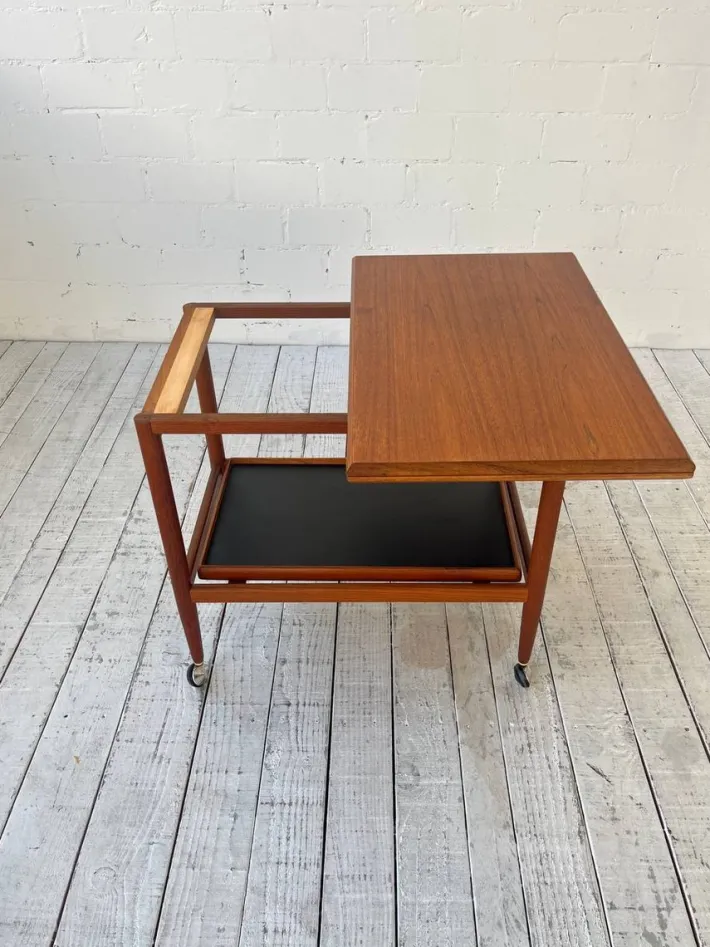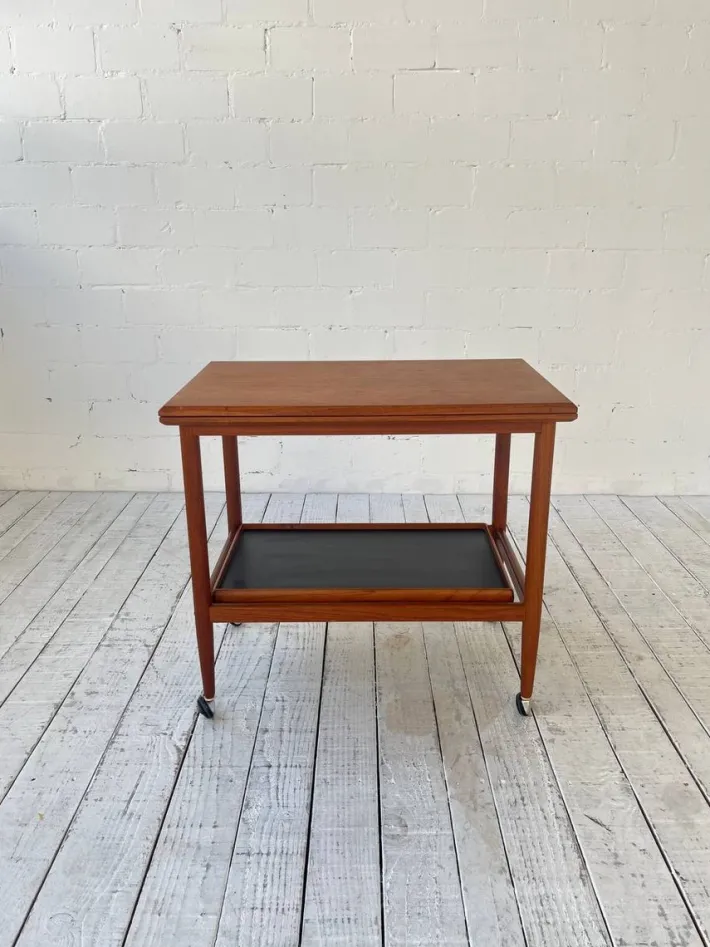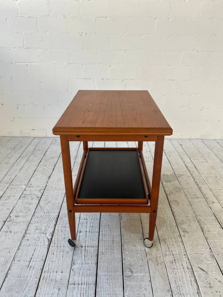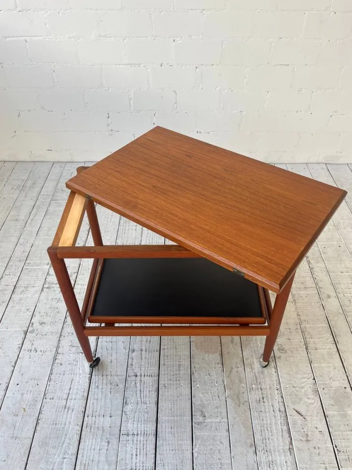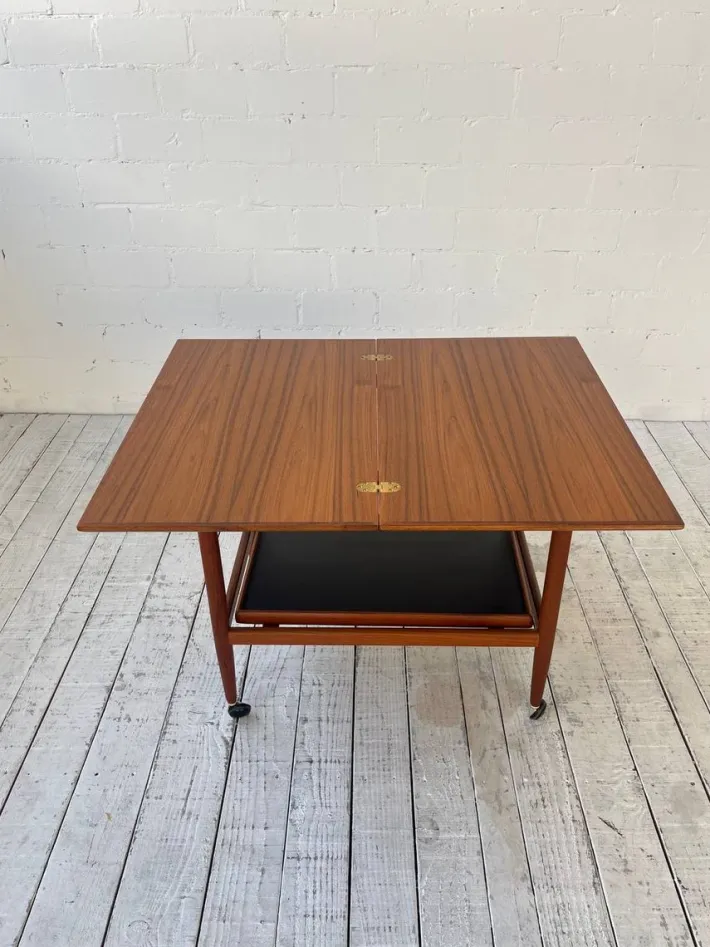 | Restoration and Damage Details | Light wear consistent with age and use, Sehr guter Vintage-Zustand mit leichten altersbedingten Gebrauchspuren. Die Rollen drehen sich einwandfrei, die Scharniere sind in sehr gutem Zustand. Holz wurde geschliffen und geölt. |