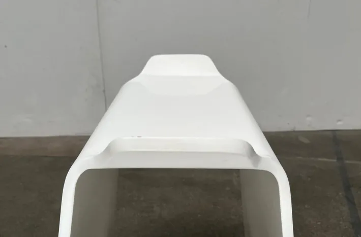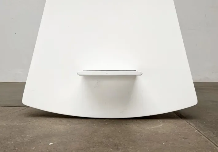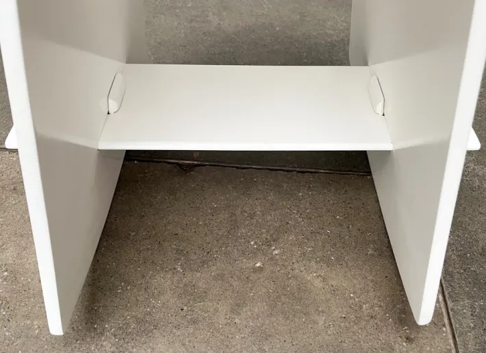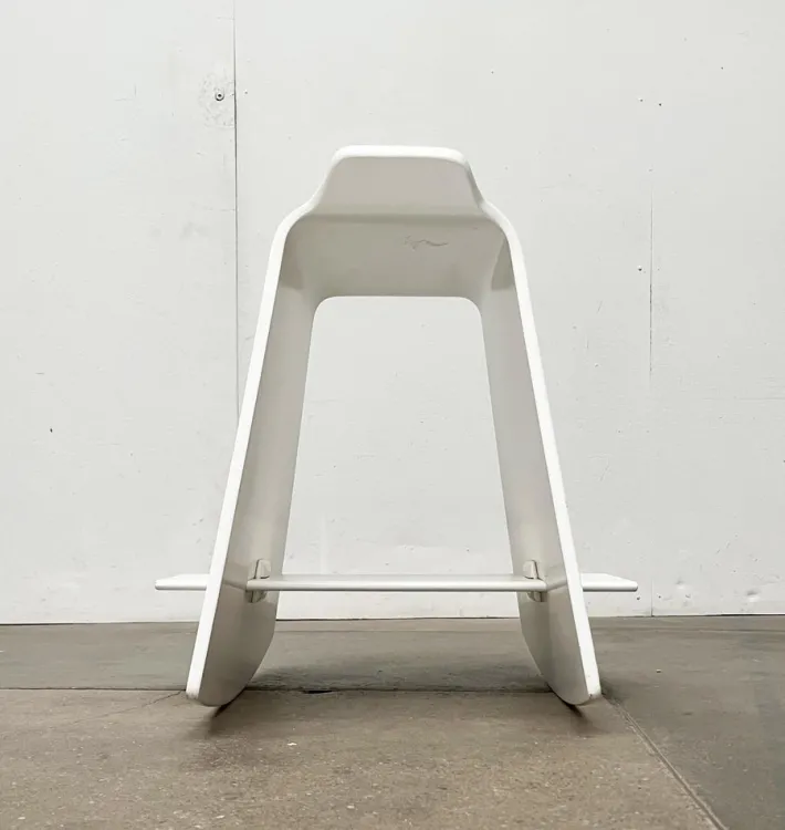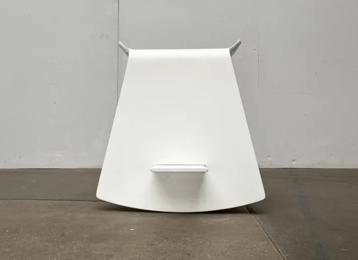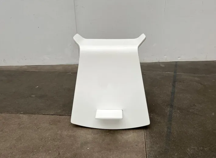 A functional and elegant design object. The stool is formed from a piece of plywood. At the top it forms a seat that is slightly pulled up to the front and back. It will be run down below. The shape is fixed with a wedged board, which survives on the side and can be used to park the feet.