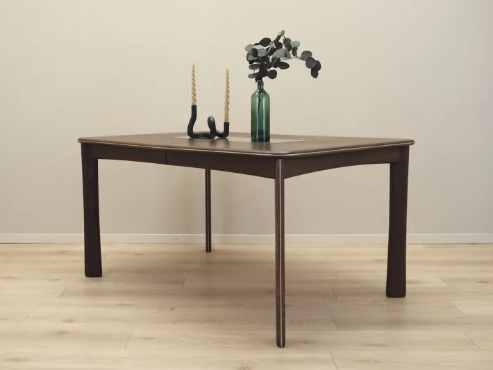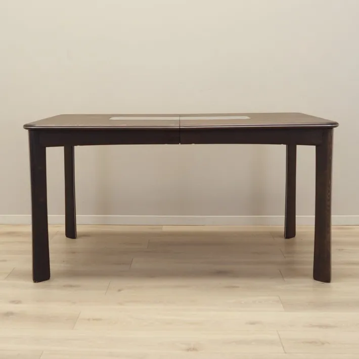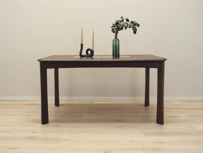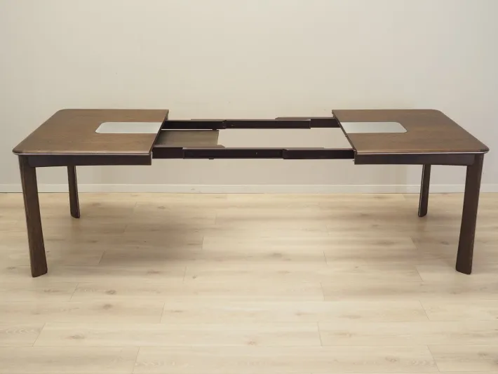 The frame and tabletop are covered with oak veneer. The tabletop features a metal insert, which gives the whole piece an elegant look. The legs are made of solid wood. The surface has been refreshed. The table has an extendable top. The table’s structure has been designed so that the additional inserts are a solid and stable extension of the main top. One insert is included.