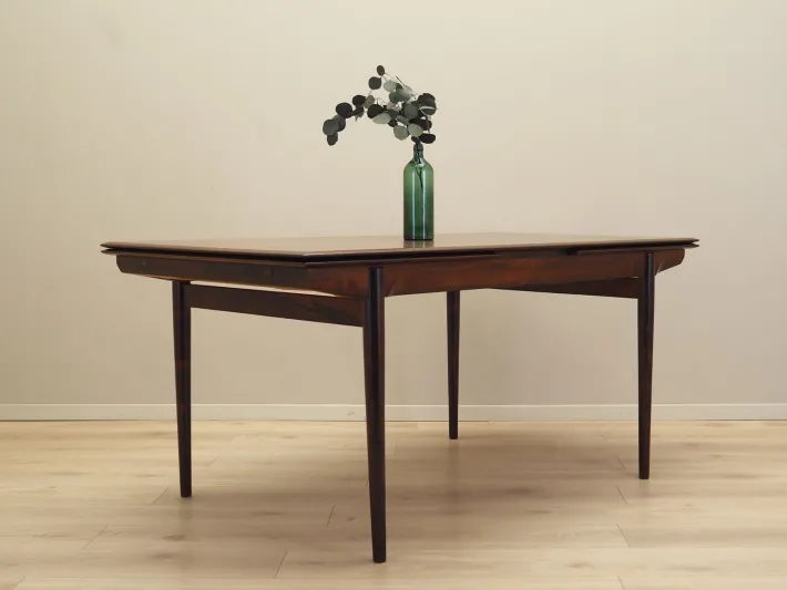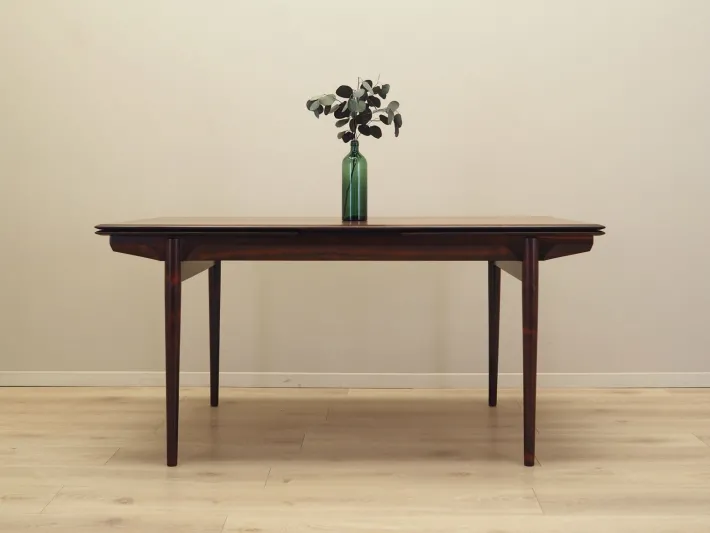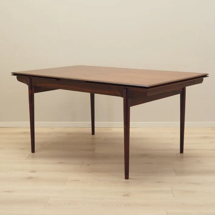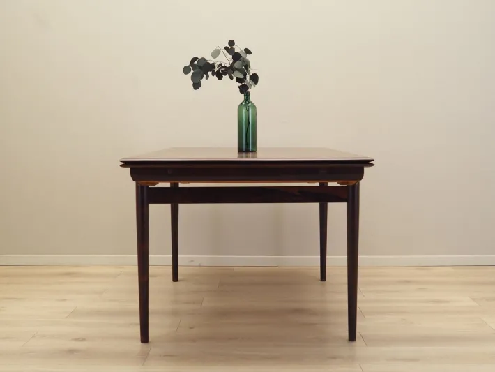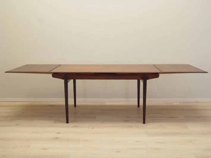 The frame and tabletop are covered with rosewood veneer. The legs are made of solid wood. The surface has been refreshed. The table has an extendable tabletop. The table frame has been designed so that the extendable inserts are a solid and stable extension of the main tabletop. Two inserts are included.