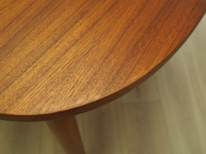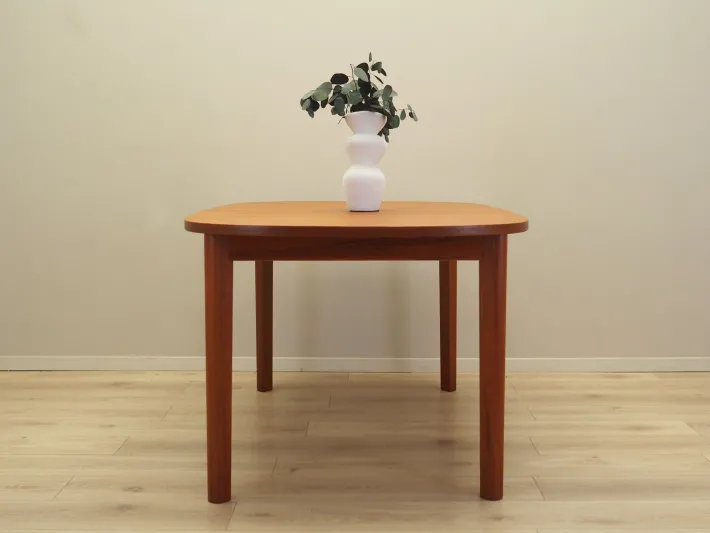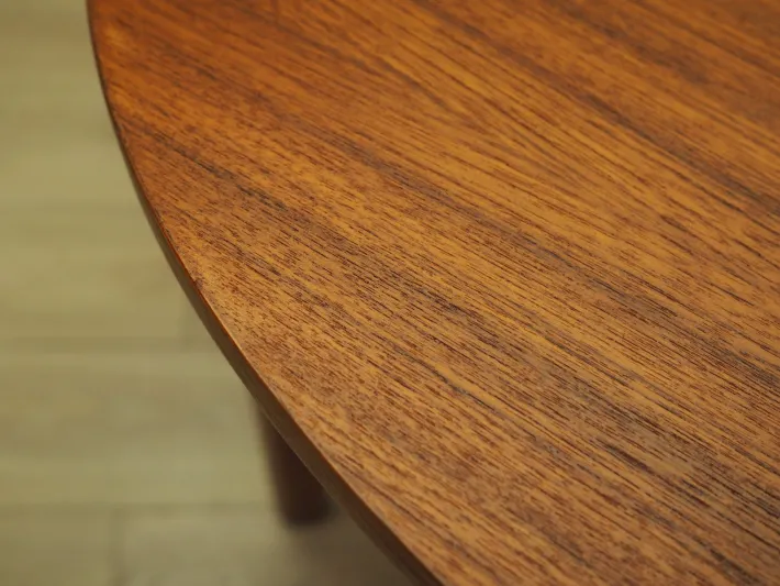 The frame and tabletop are covered with teak veneer. The legs are made of solid wood. The surface has been refreshed. The table has an extendable tabletop. The table frame has been designed so that the additional inserts are a solid and stable extension of the main tabletop. Two inserts are included.