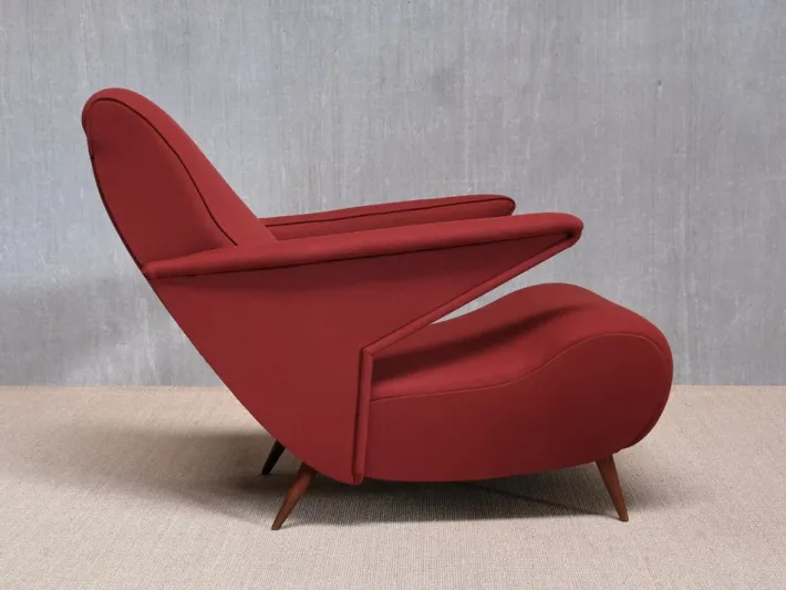 The design features a low, organically rounded seat and backrest paired with sharply angular armrests that extend outward in a wing-like gesture. Its silhouette combines soft curves with geometric tension, while the backrest can be manually adjusted into three positions: upright, reading, and almost fully reclined. The chair rests on four tapered walnut legs, reflecting the lightness and elegance typical of the period.