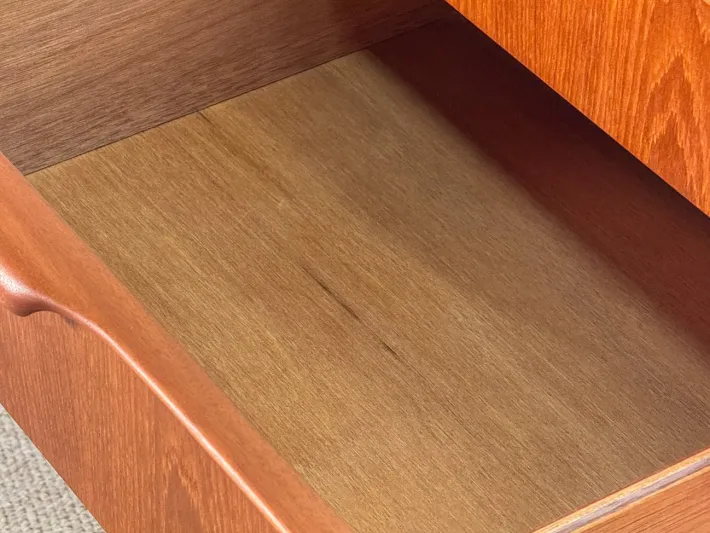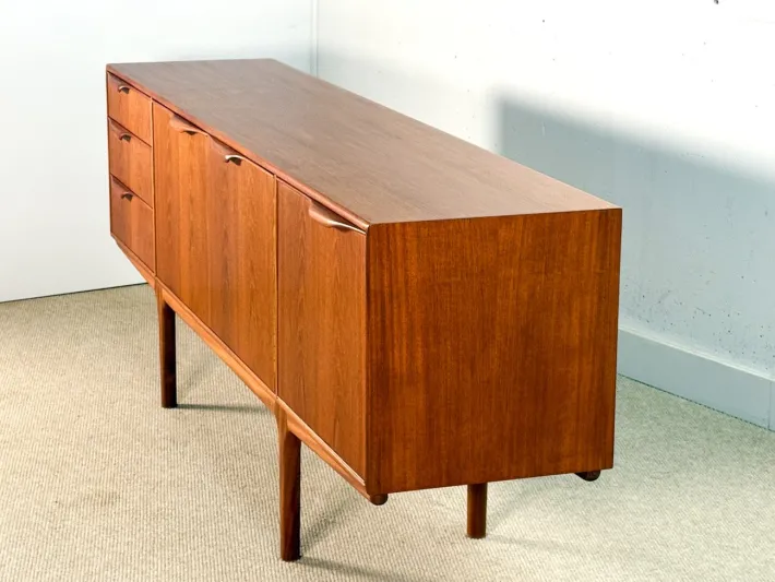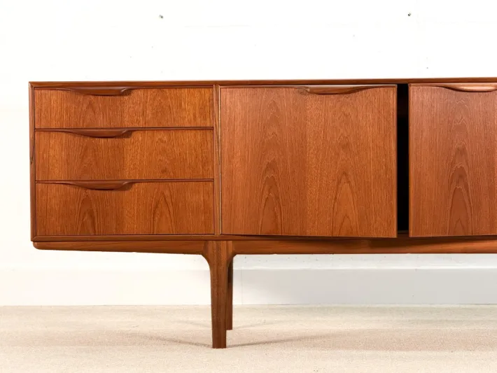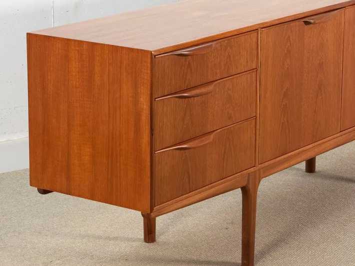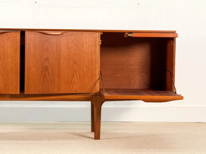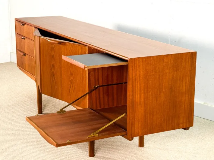 The sideboard has undergone a meticulous restoration and displays only two minor imperfections down the right long handle, which could not be removed during the process. This elegant piece features three spacious drawers on the left side, a centrally positioned double-door cabinet with a charming curved tray, and a bar cupboard on the right that includes a convenient pull-out tray.