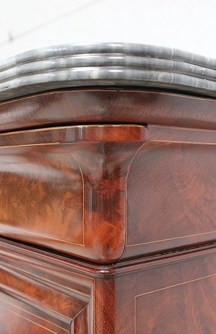 Below, it consists of a slaughter discovering a space – consisting of most lemon tree – with two shelves and eight small drawers of different capacities. Two of them are secret, the others open with small brass drawing buttons finely carved in flowers. All are embellished with amaranth nets forming frames. Detail rare enough to be underlined, the interior of these drawers is in mahogany.