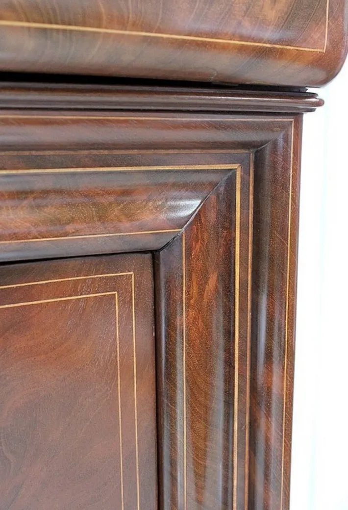 We will also appreciate the Doucine moldings framing the central part of the furniture, as well as the discreet but omnipresent lemon nets, visible on the songs of the shelves, the apparent side of the feet, the sides …