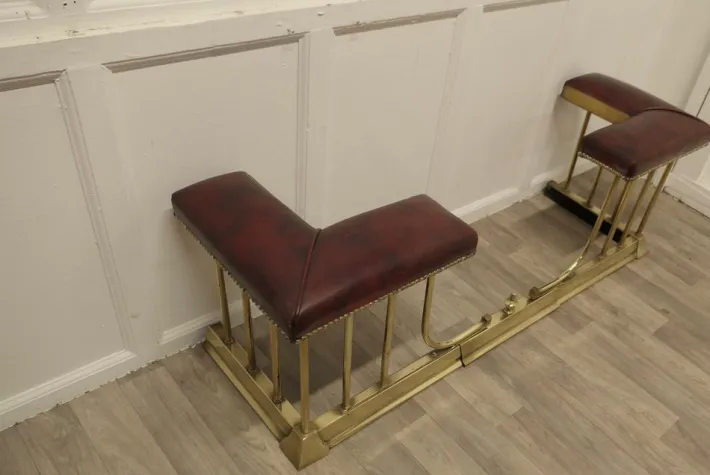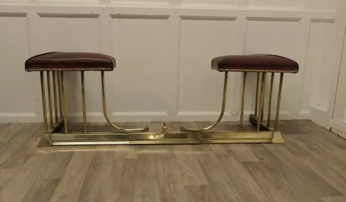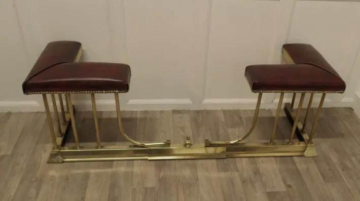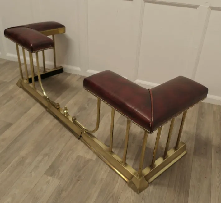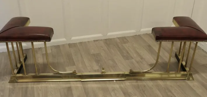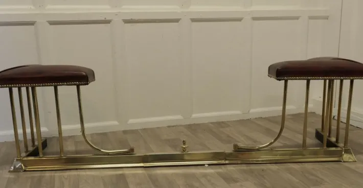 This is an elegant piece of country House Furniture with dark red leather studded seats and it can be pulled out to alter the size to fit your hearth