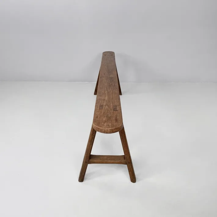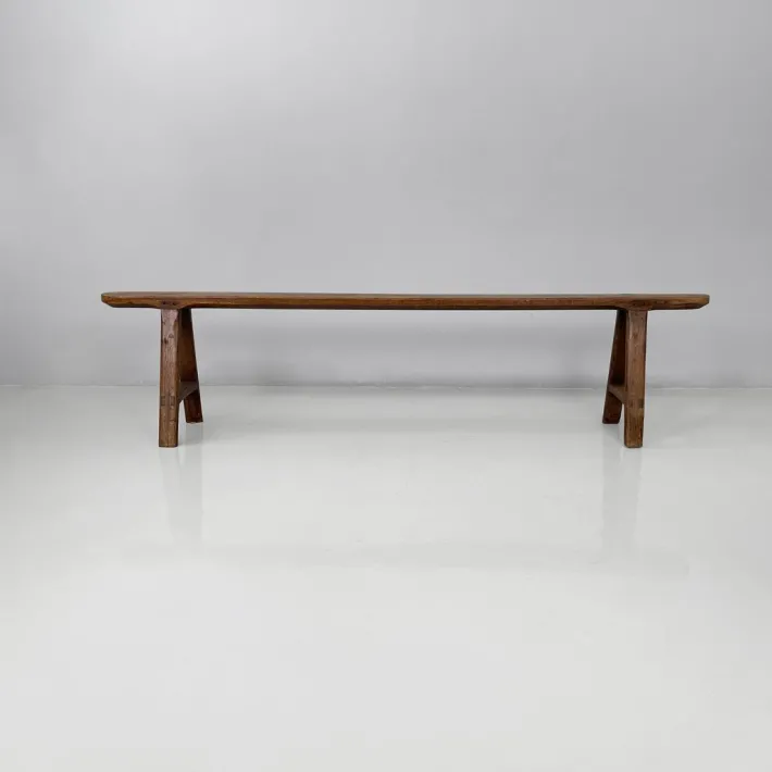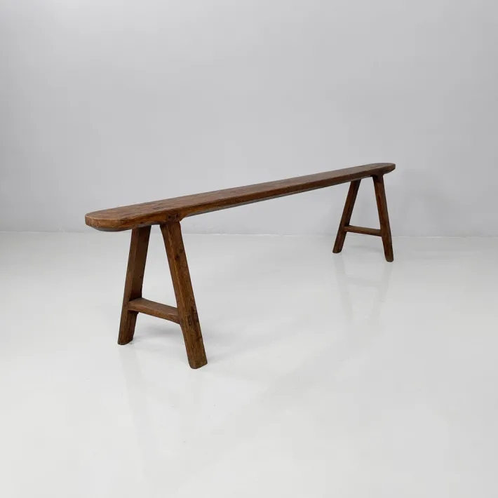 Bench with narrow and long seat with rounded corners, entirely in solid wood. The legs of the square section bench are positioned diagonally joined by a strip.