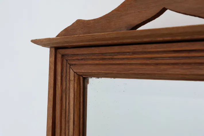 Beautiful vintage solid oak wall cabinet with a small drawer and a beveled mirrored door. This shaving cabinet has elegant lines, very nice decorated handles and geometric carvings. Behind the door one shelf. The shaving or medicine cabinet has some non disturbing small wear marks (see pictures).