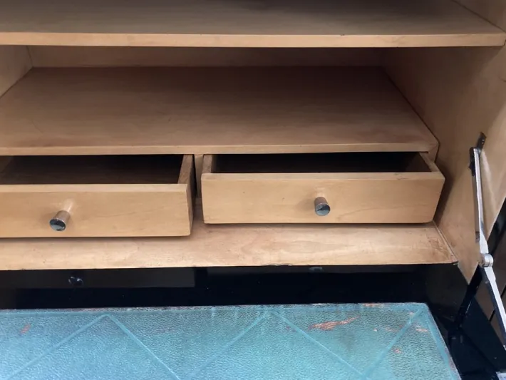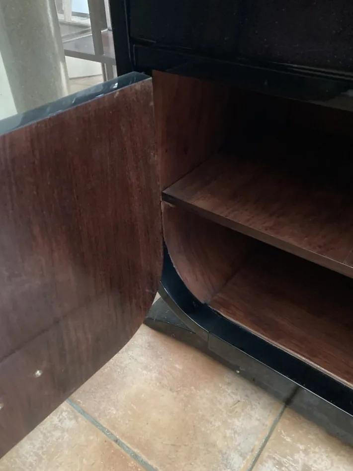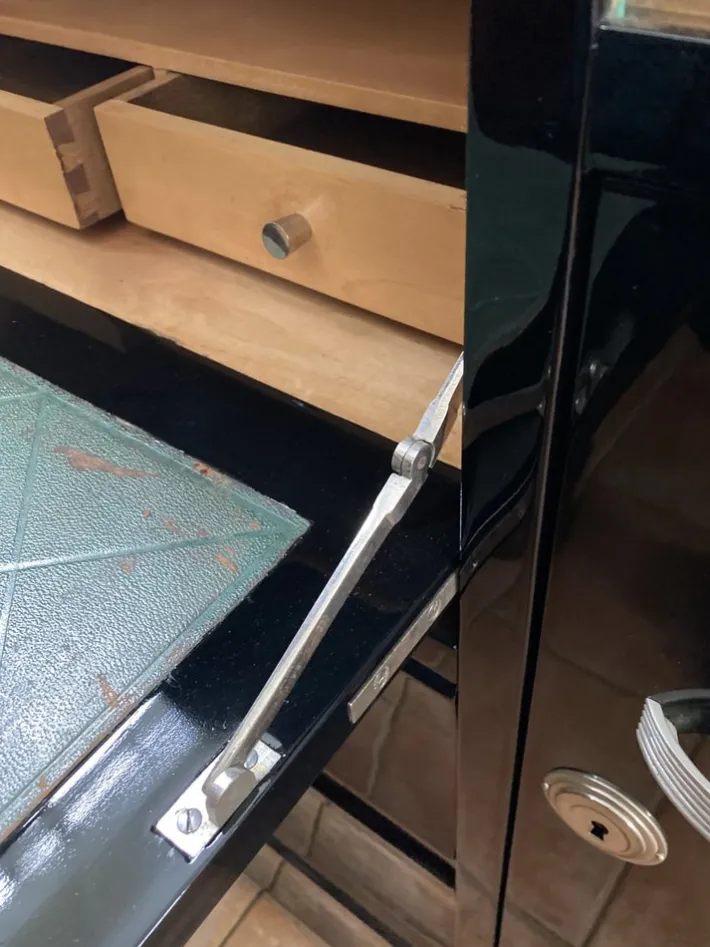 Original handles. Original green leather plate with slight signs of wear. Very elaborately crafted silver-plated key. Black high gloss painted by a specialist. The fine interior was elaborately manufactured. Step-shaped structure with a small display shelf with glass panels. This gives the secretary a certain lightness and can be used multiple times.