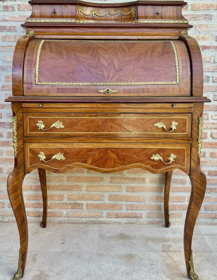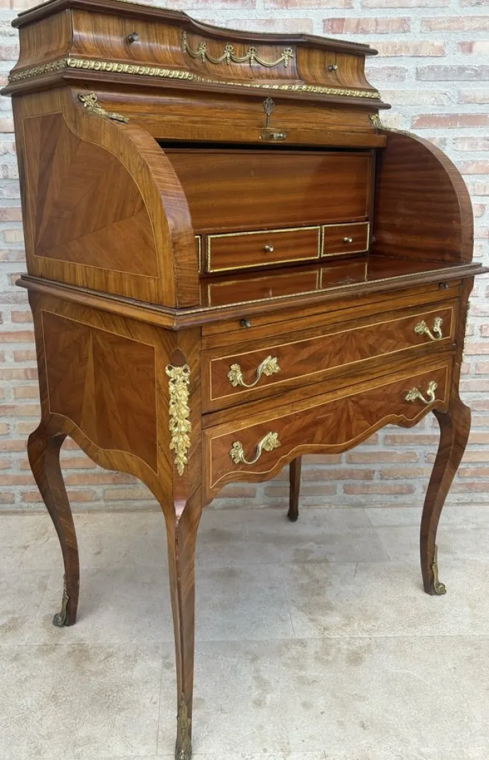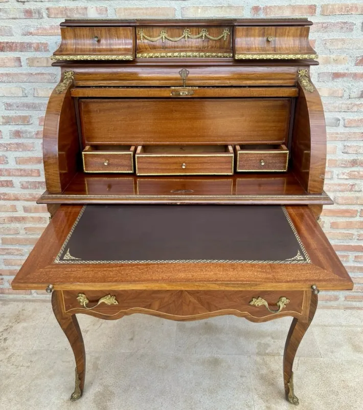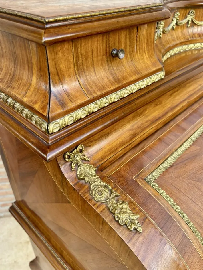 Wood and bronze. Writing surface and compartments can be pulled out under closure. Cut-out frame drawer. brass gallery. Veneered on the back. High curved legs with bronze mounts and feet.