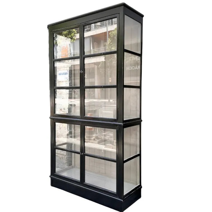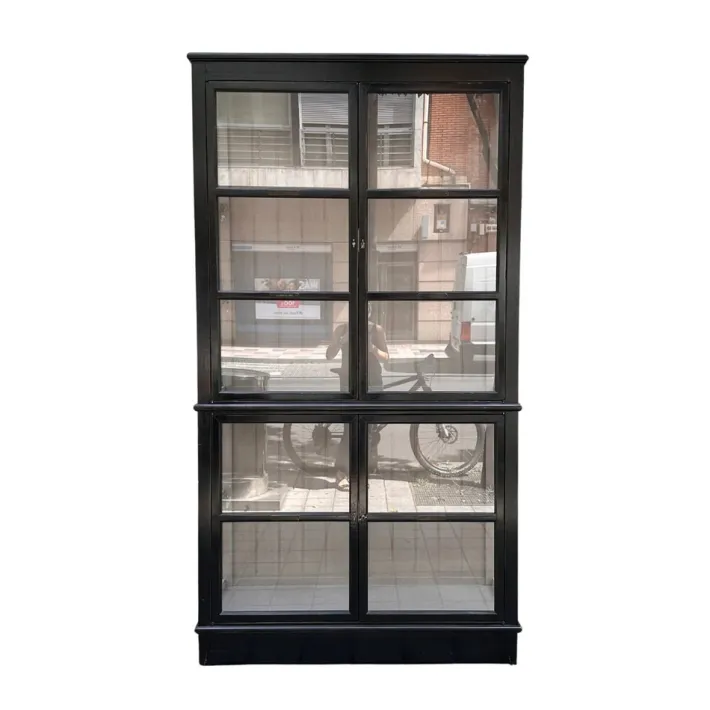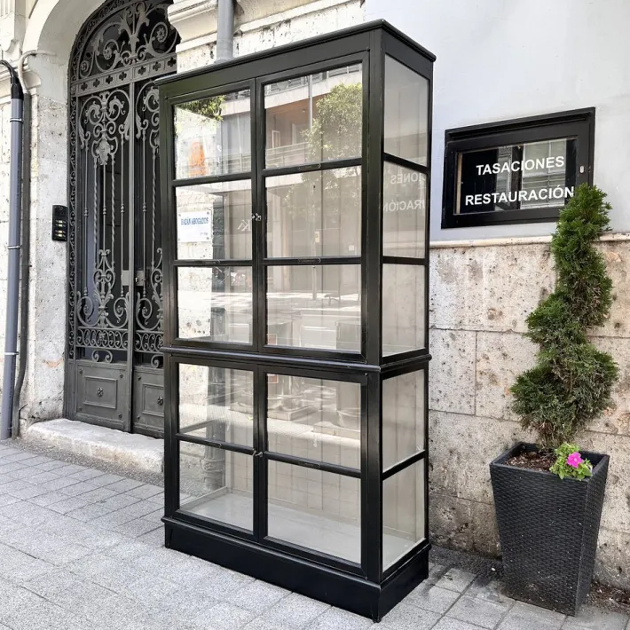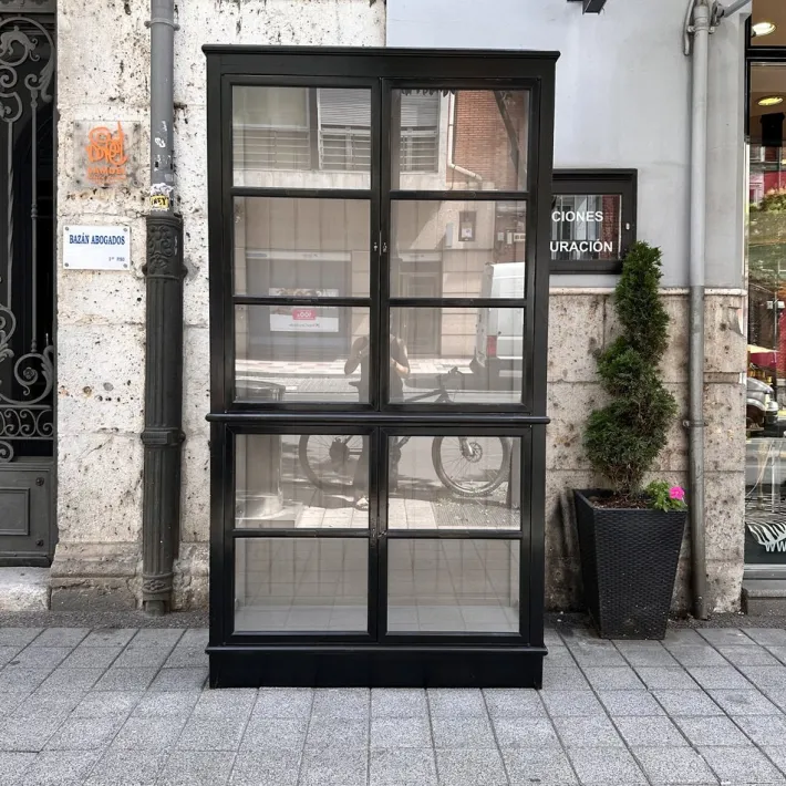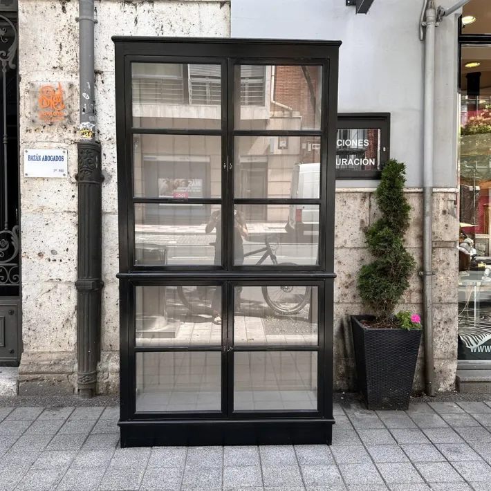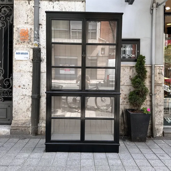 Exquisite architect’s display case or bookcase by the renowned French firm Roche Bobois. It combines elegance with functionality thanks to its sophisticated and refined design. Its wooden structure follows a vertical, rectangular shape divided into two connected modules. It opens through four doors, two in the lower module and two in the upper. Each door, like the sides, features partitions with large glass panels inserted to display the objects inside. The back features original wood paneling that gives the piece its personality.