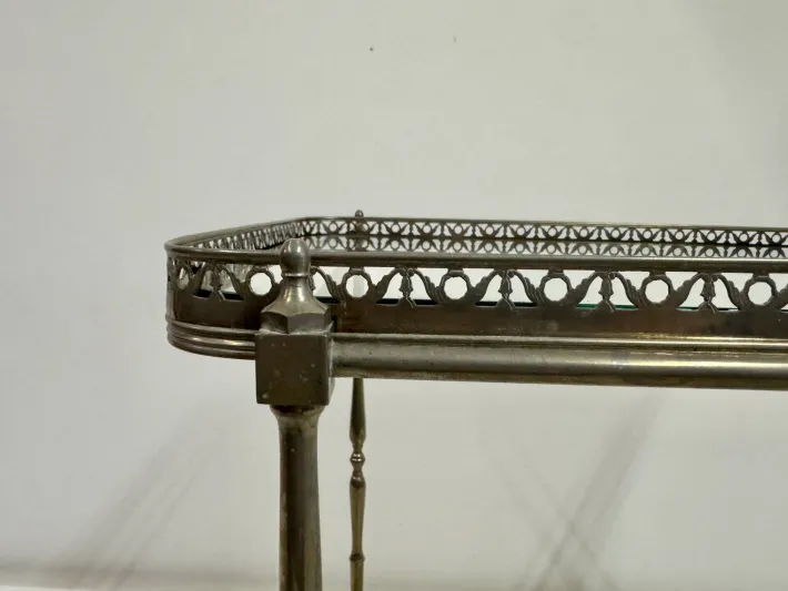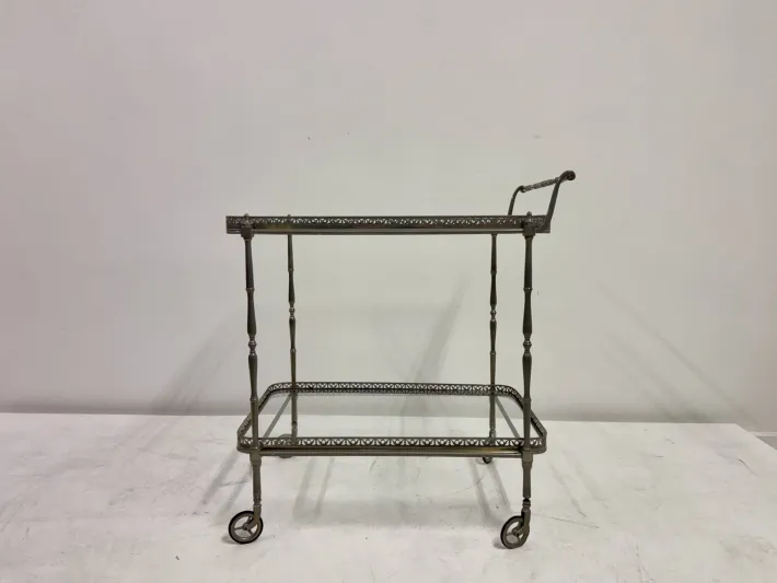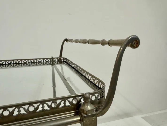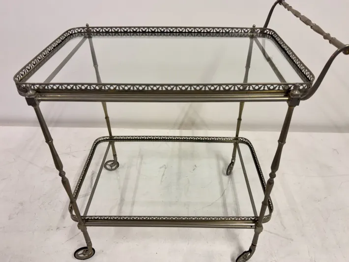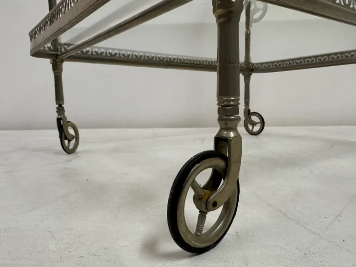 A finely made French drinks trolley from the 1960s, constructed in silvered metal with a graceful, time-softened patina. The frame rests on small spoked wheels and is detailed with slender turned supports, each rising to a pierced gallery edge that encloses two tiers of clear glass. The design balances practicality with elegance, its proportions refined yet sturdy.