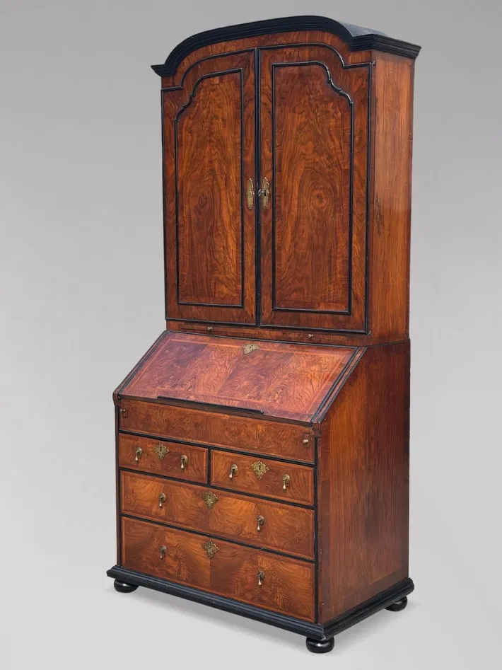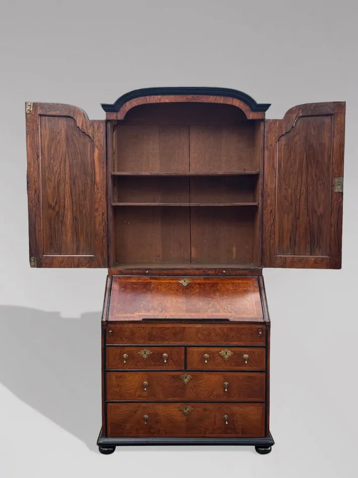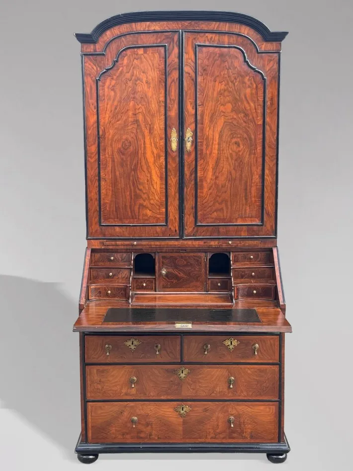 The figured walnut exhibits a rich, warm patina, perfectly complemented by the exquisite black mouldings. This bureau bookcase is not only a testament to exceptional craftsmanship but also a stunning example of early Georgian design, making it an ideal piece for any refined interior.