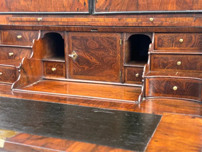 The lower bureau section consisting of a finely figured burr walnut fall with herringbone crossbanding and moulded ebony edge with brass escutcheon and original lock, this opening to reveal a nicely fitted interior consisting of a sliding panel with well below, a central door with pigeon holes and waterfall drawers to either side. The writing surface having a walnut banding with central black leather which has been retained for originality.