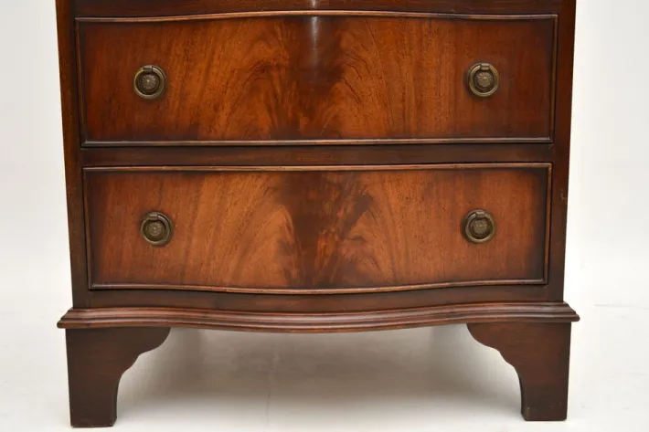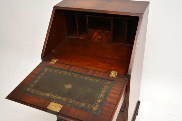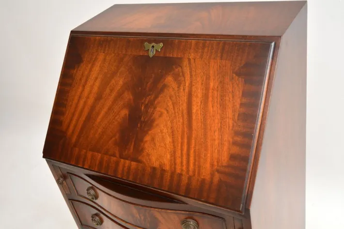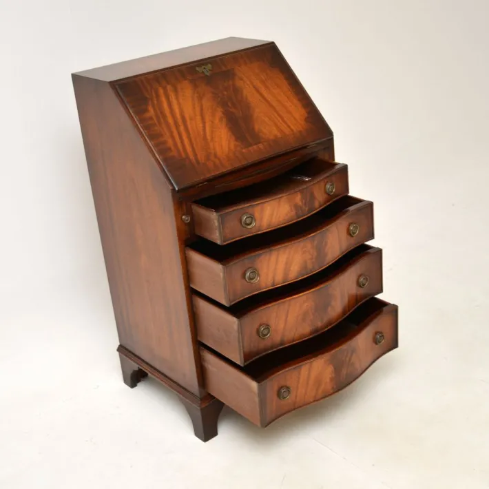 The quality is fantastic, this is beautifully designed with a compact and very practical design. There is a good size work space when the writing flap is pulled down, there is also lots of storage space in the lower drawers. This has lovely brass handles, it sits on bracket feet and has a serpentine shaped front.
