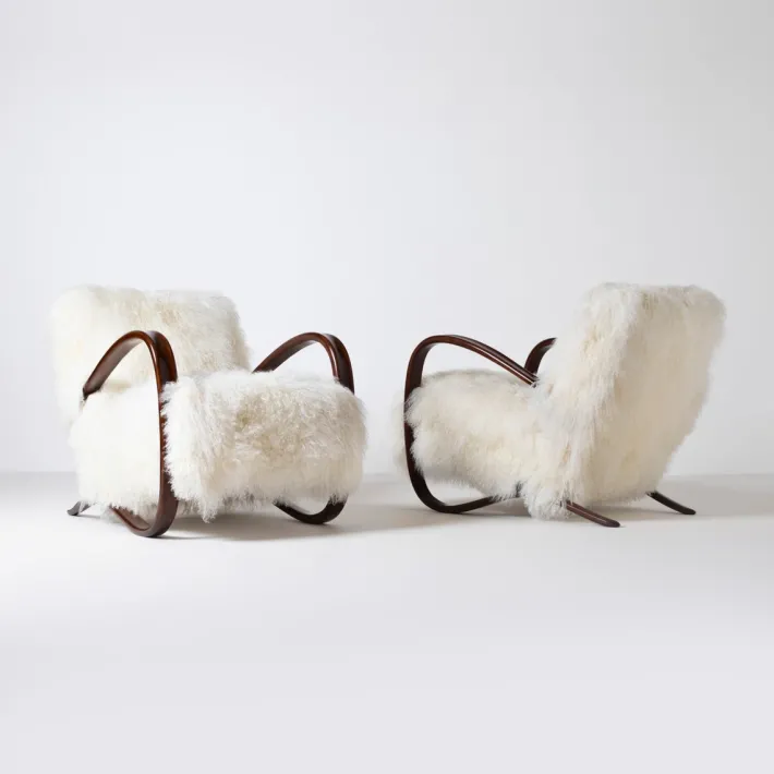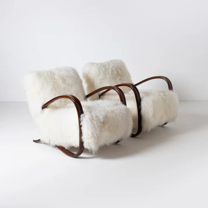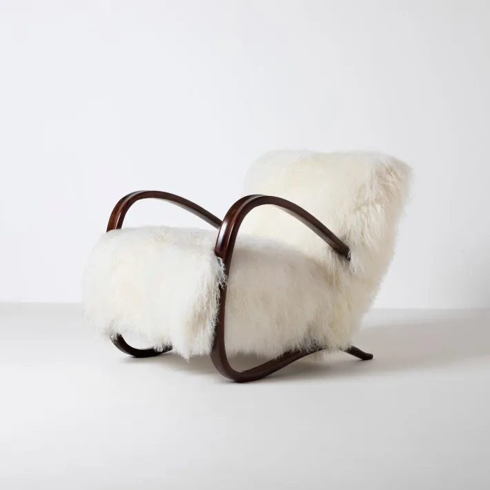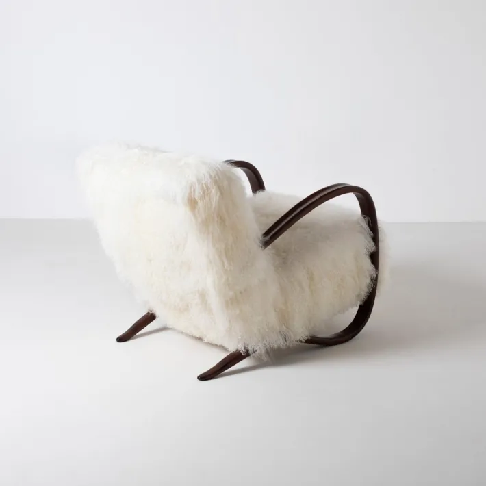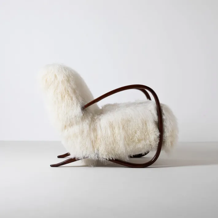 Fully restored and reupholstered in exclusive mongolian long hair curly sheepskin.