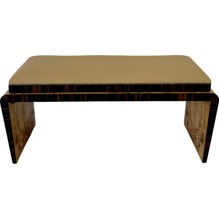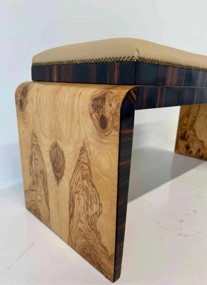 The structure combines rare olive ash burl with Macassar wood, creating a striking contrast of tones and textures. The seat is upholstered in refined faux leather, ensuring both comfort and style. Designed and finished on both sides, this piece can be placed freely in the center of a room, enhancing its decorative impact.