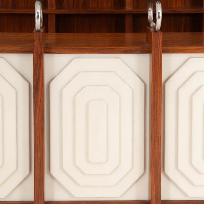 with its sculptural walnut wood structure, chrome details, and floating glass top, this bar unit is a functional artwork. The white geometric panels on the front add a playful yet architectural contrast, while the built-in shelving and chrome spotlights above elevate it from furniture to installation. It’s a conversation starter — even before the cocktails are poured.