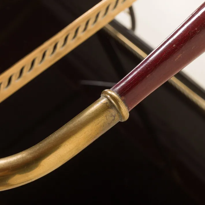 The bar cart is in fantastic original vintage condition with minor very signs of wear and a light patina on brass details (it has ben cleaned though). Fully functional, the wheels work smoothly. The wood was cleaned with professional components.