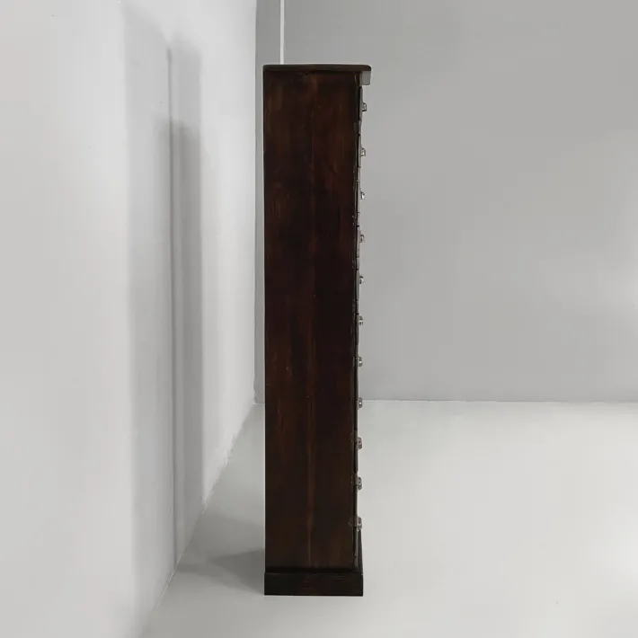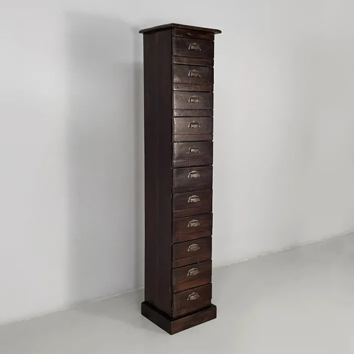 Chest of drawers with square base, in wood with metal handles. The front features eleven rectangular drawers. It can be used as a filing or archive cabinet.