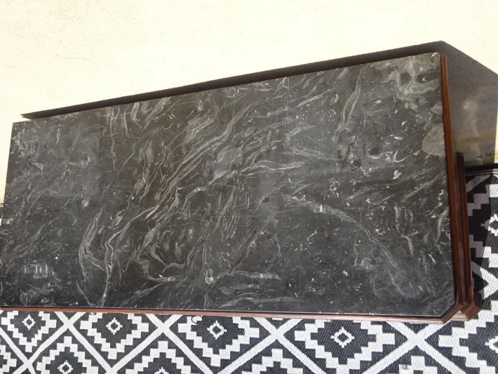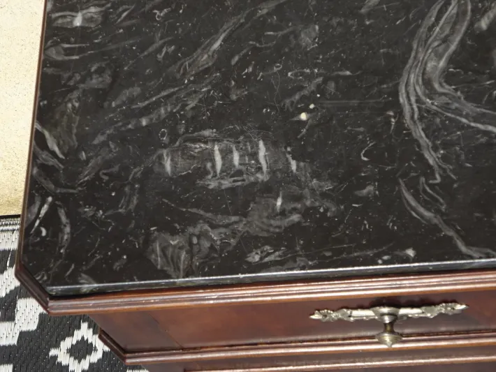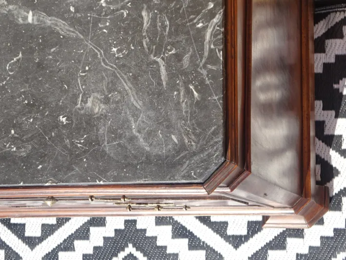 The top is 18 mm thick black/gray marble with beveled front corners to perfectly match the shape of the piece. The front legs are clad in wood in the Louis Philippe style.