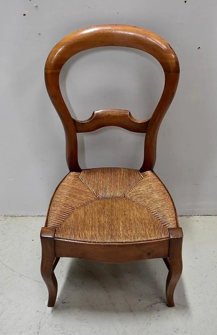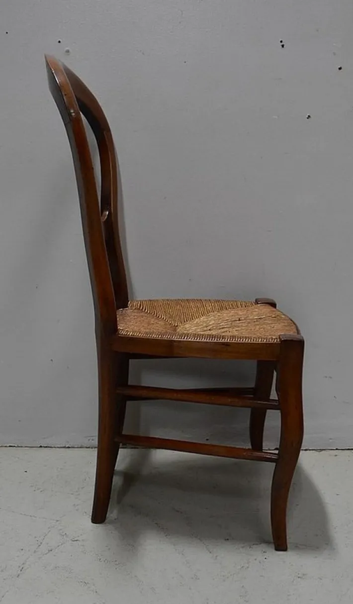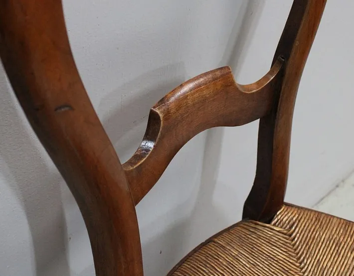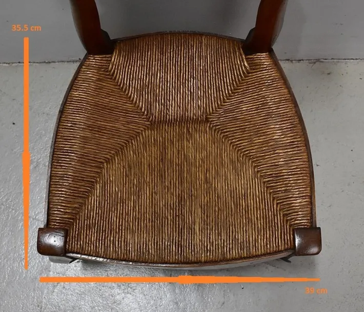 It rests on two curved feet at the front, and at the back on two straight feet, less pronounced spacing. This chair is reinforced by the presence of a pair of bars on each of its sides, a single on the back. A large crossing discreetly songwrited composes the front facade.