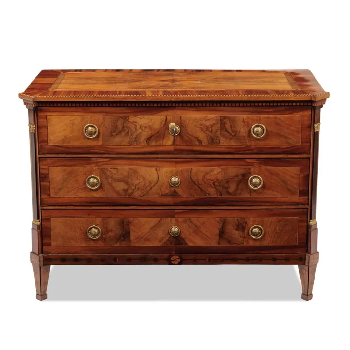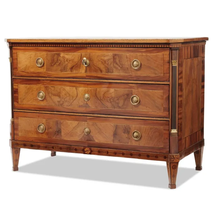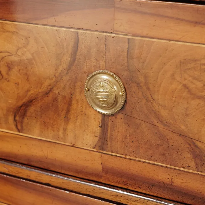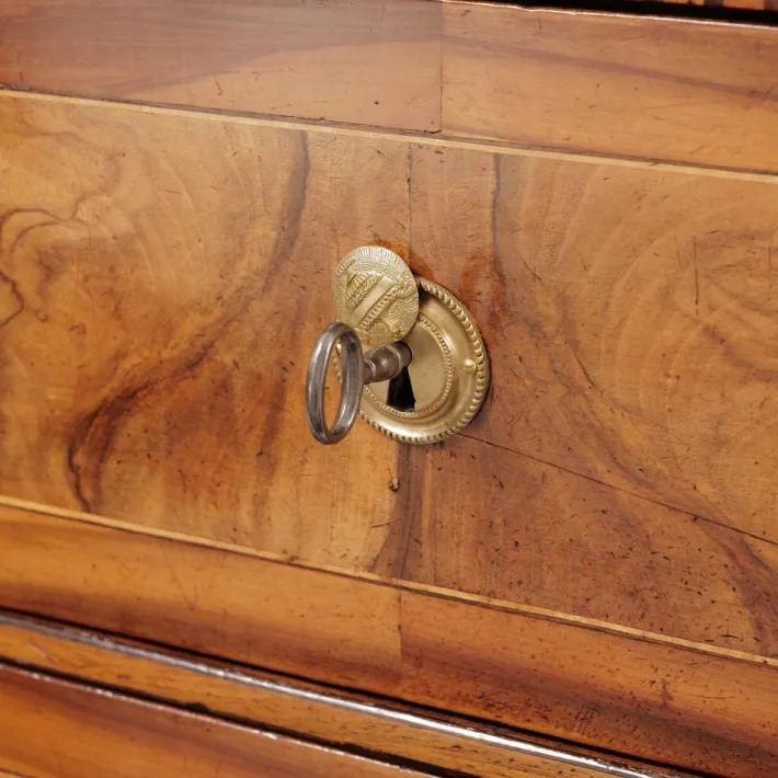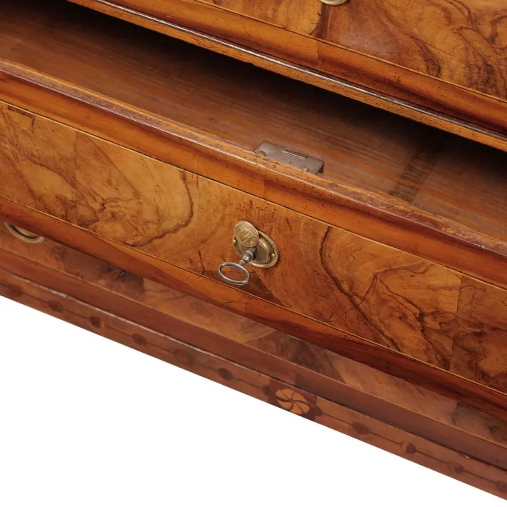 Furn the walnut and plum wood on softwood corpus, band intarsia, the edges all around with maple and ebony, three pushing, original fittings and locks, sliced pilasters with attached ebonized pilasters with fire-gold-plated bases and capitals made of bronze, shellac wax hand polish