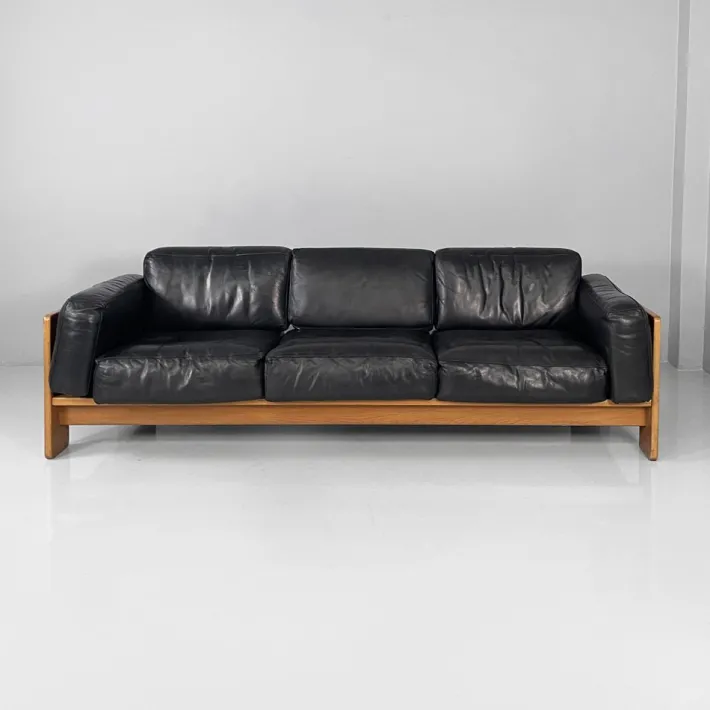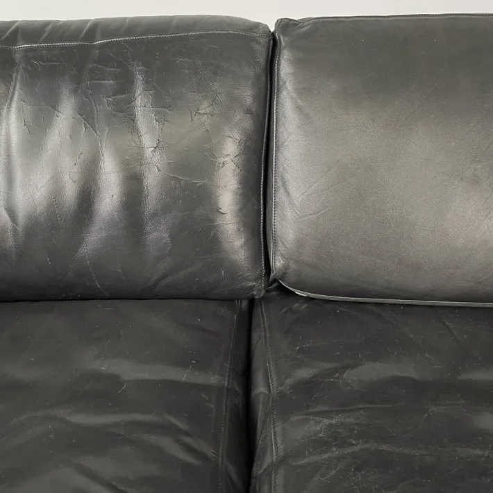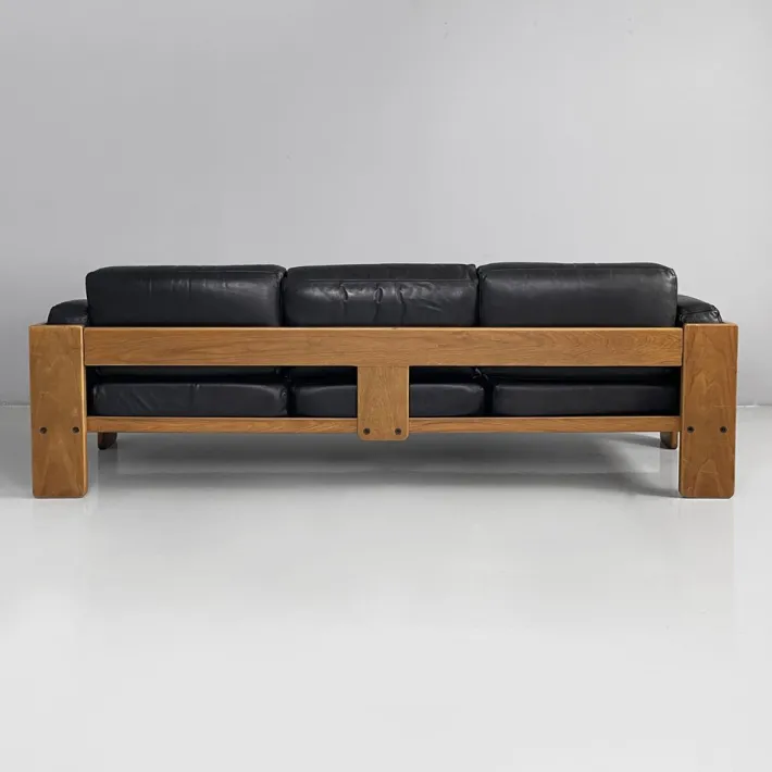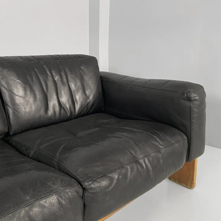 Three-seater sofa model Bastiano with seat, backrest and armrests made of padded square cushions upholstered in black leather. The structure of the couch is made of wooden slats.