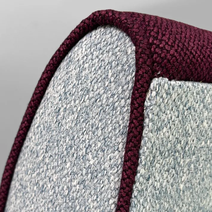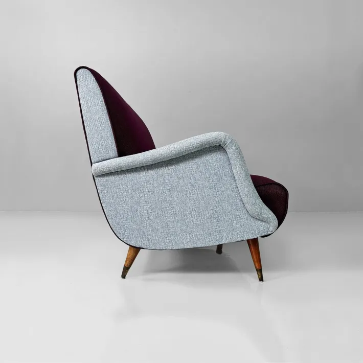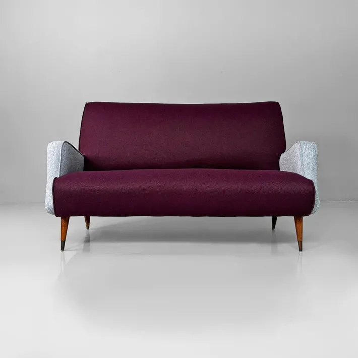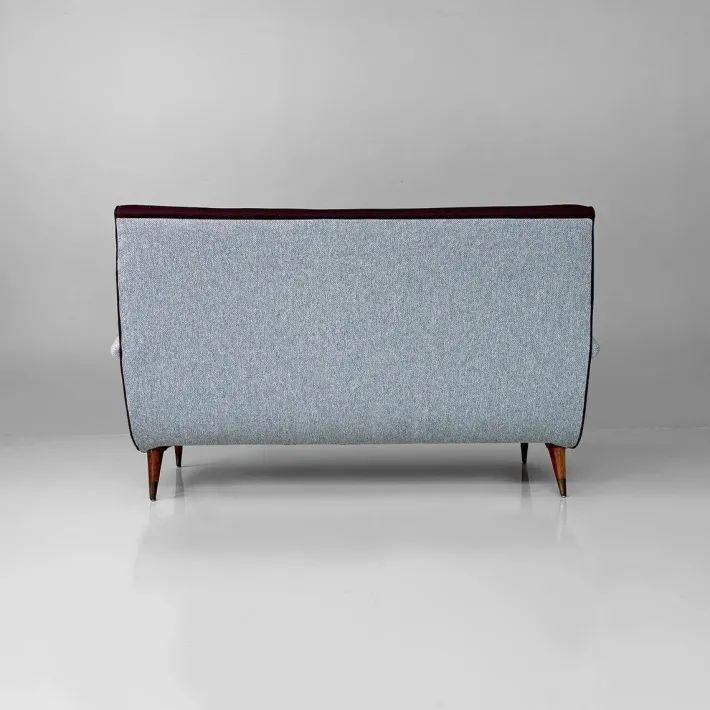 Couch model 801 in wood and fabric. The frame is wooden and the legs are turned. Metal feet. Upholstery in dark purple and light blue padded fabric.