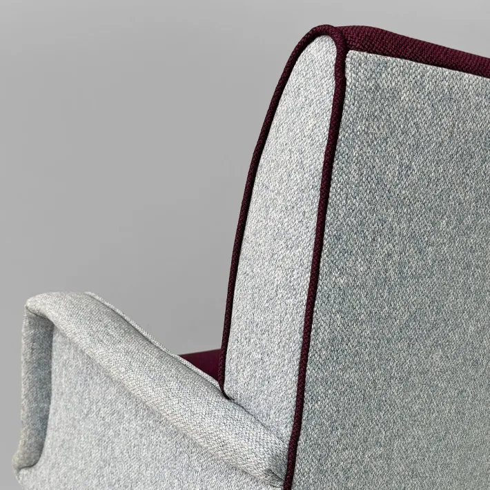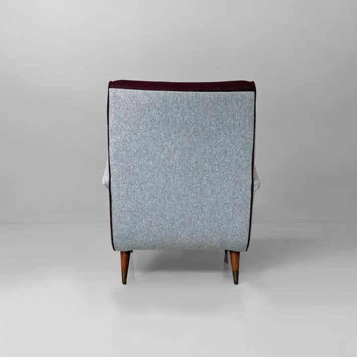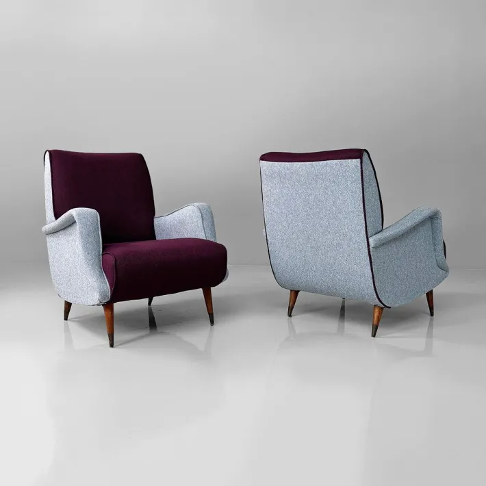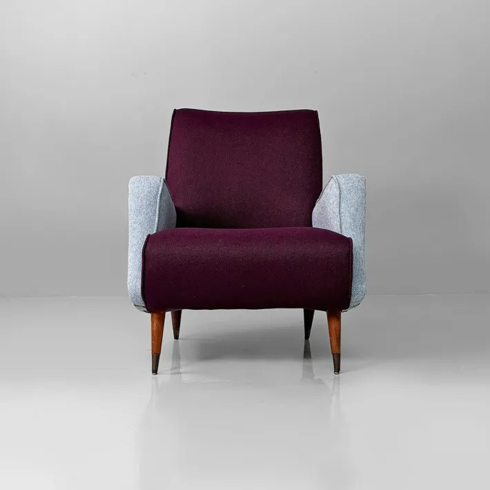 Pair of armchairs model 802 in wood and fabric. The frame is wooden and the legs are turned. Metal feet. Upholstery in dark purple and light blue padded fabric.